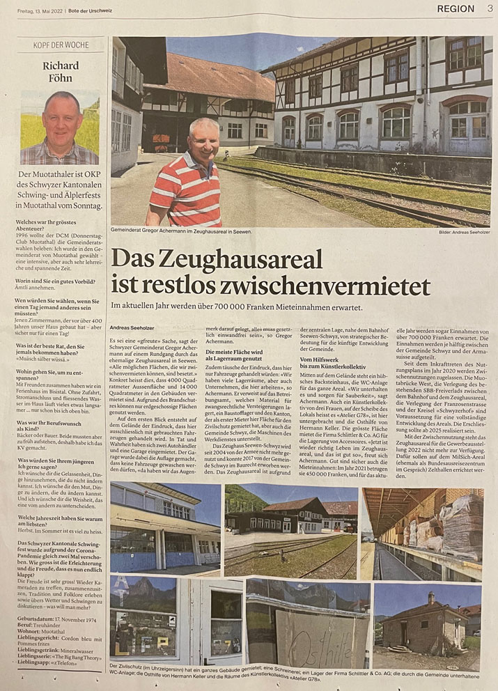 Auf die Frage, weshalb die GEWA Innerschwyz nicht mehr wie gewohnt auf dem Gelände des ehemaligen Zeughausbetriebes durchgeführt wurde, lieferte Vize-Gemeindepräsident Gregor Achermann in einem Zeitungsbericht ('Bote der Urschweiz') vom 13. Mai 2022 die Antwort: