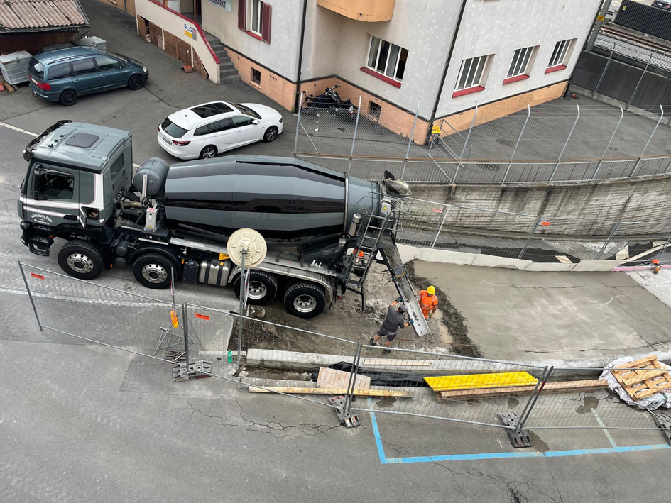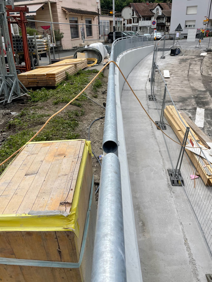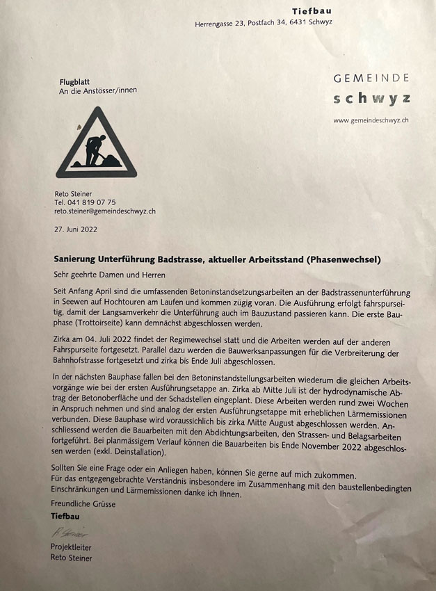 p. Sie erschallen das halbe Quartier, die Beton-Abtragungsarbeiten an der dorfverbindenden Unterführung zwischen der Bad- und Bahnhofstrasse. Doch ein Ende ist absehbar, wie einem Flugblatt der Abteilung Tiefbau der Gemeinde entnommen werden kann. Bekanntlich wird die Unterführung erstmals seit deren Bau umfassend saniert. Vor allem bröckelnder Beton und eine Bombierung der Fahrbahn mitten in der Unterführung haben die Behörden aufgeschreckt. Dazu kam die Planung einer Verbreiterung der Bahnhofstrasse, die eine Verlegung der Treppe zur bzw. aus der Unterführung verlangt. Während der motorisierte Verkehr einen Umweg um die Baustelle in Kauf nehmen muss, ist der Fussgängerverkehr jederzeit gewährleistet.