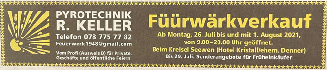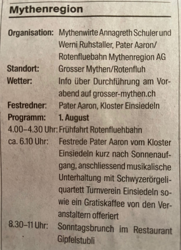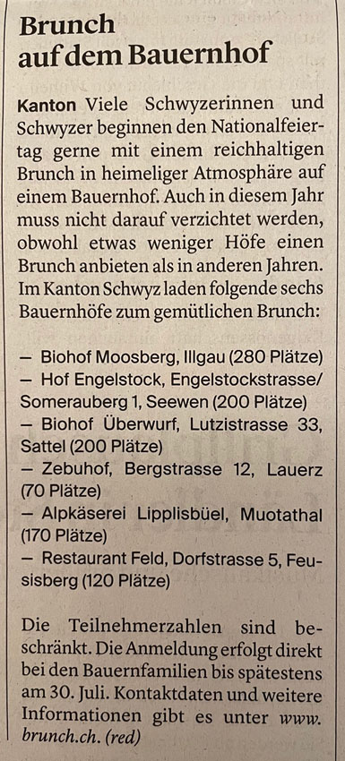 p. Die Schweiz feiert am 1. August ihren Geburtstag. Doch die Festlaune ist längst nicht mehr zu vergleichen mit jener noch vor zwei Jahren, als in jeder Ortschaft irgendein Fest organsiert wurde. 'Corona'-bedingt halt. So fielen vor allem im letzten Jahr viele Feiern komplett aus. Heuer präsentiert sich die Situation besser... In unserer Gegend wird der Fest-Reigen auf dem Grossen Mythen gestartet. Ein kleines OK und Pater Aaron laden zu einem Treffen auf dem Schwyzer Hausberg ein. Einige Stunden später dann lädt die Hauptortgemeinde zu ihrer Feier ein. Heuer findet diese auf dem Areal der Badi Seewen (bei schönem Wetter) oder dann im nahen Stadion 'Zingel' (bei schlechter Witterung) statt. Das Vorprogramm beginnt um 11 Uhr, die eigentliche Feier startet um 11.30 Uhr. Mit-Organisator ist der Einwohnerverein Seewen. Als 'Dank' an der Teilnahme offeriert die Gemeinde den Anwesenden ein Mittagessen. - Auch zu einem solchen rufen Landwirte, die zum 'Buurähof-Brönsch' einladen. In Seewen ist es die Familie Suter hoch oben am Engelstock, die Gäste empfängt. Auch einige Gastbetriebe laden zu Sonderangeboten ein, die sie zum Anlass des Bundesfeiertages feilhalten.