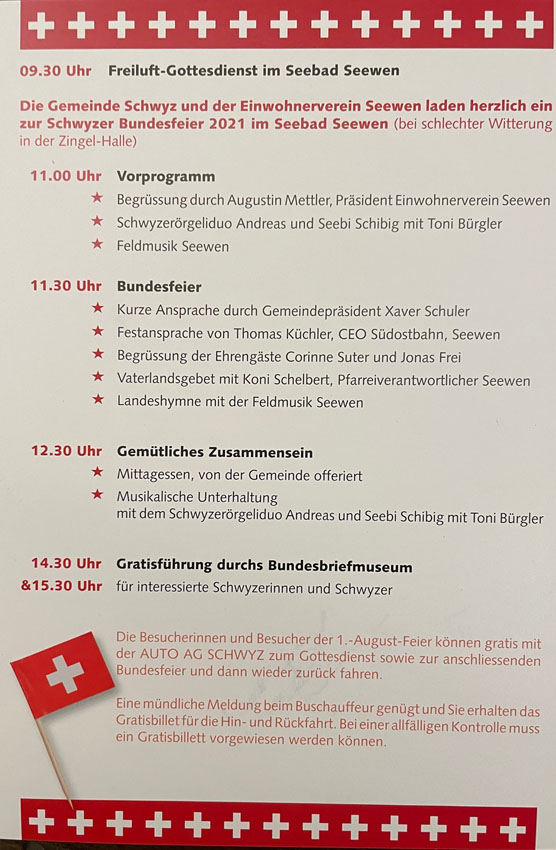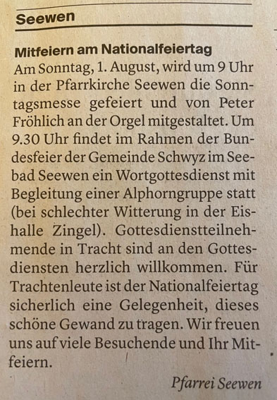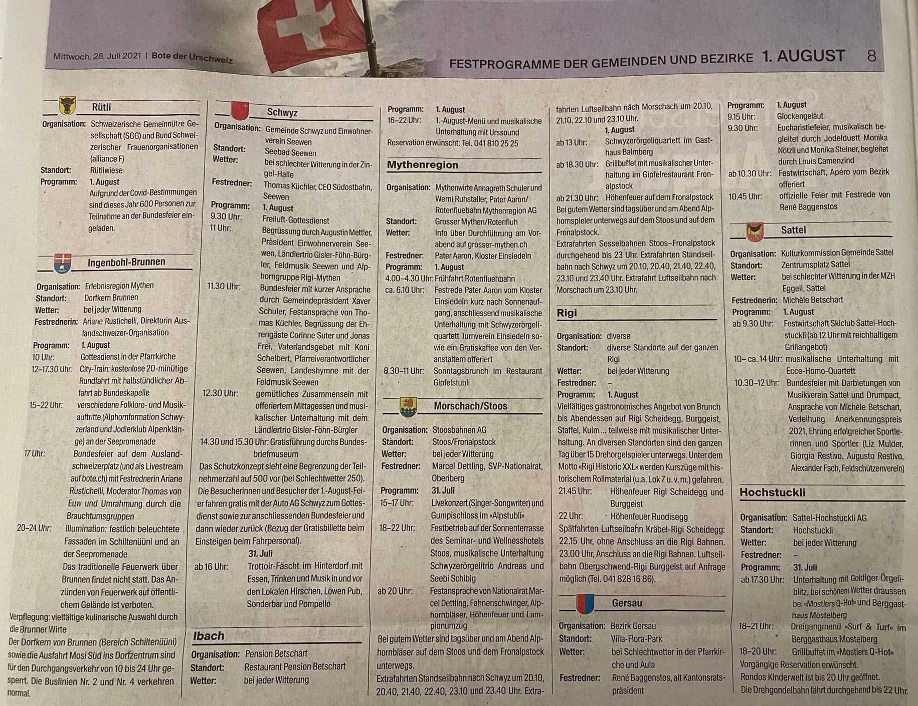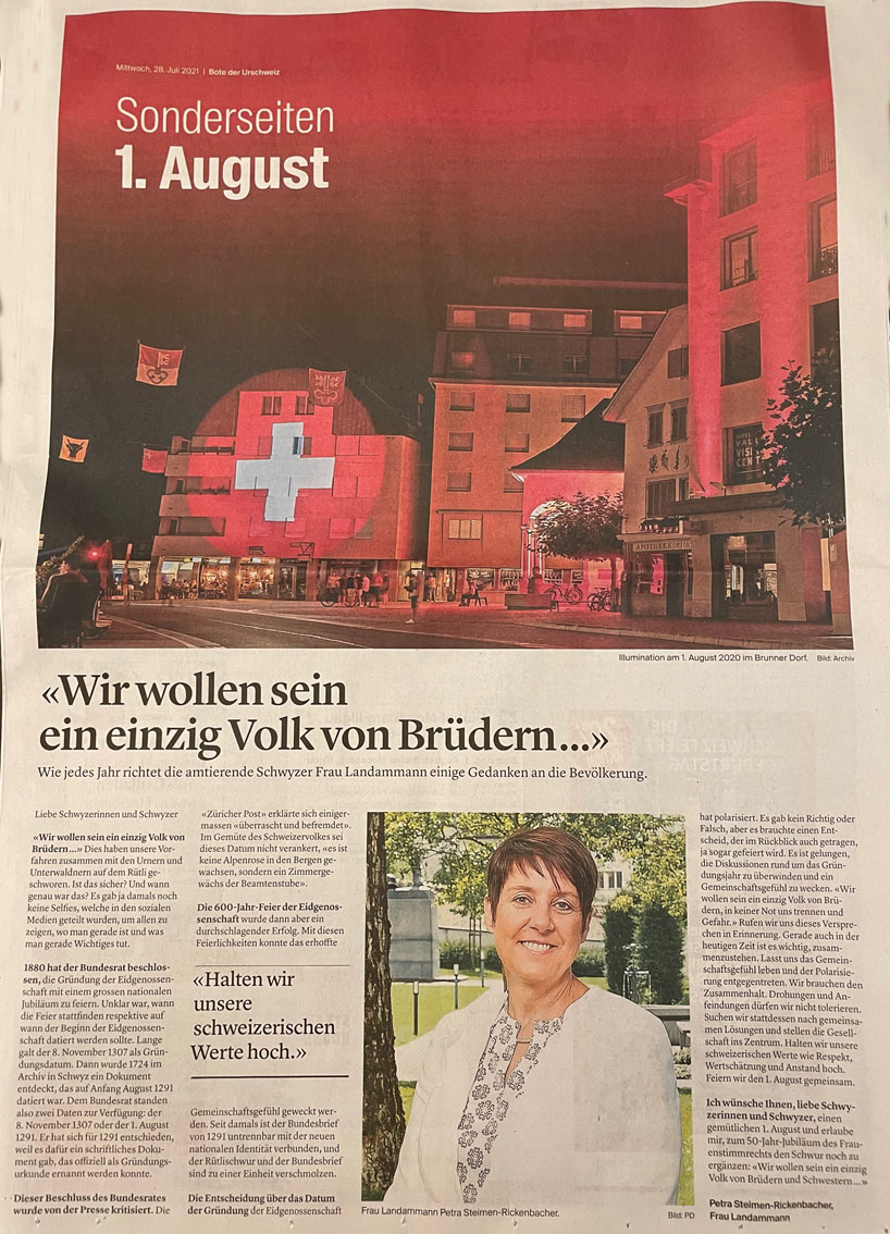 Nachstehend einige Infos aus dem 'Bote der Urschweiz' und der 'Gmeindsposcht Sommer 2021' zum Nationalfeiertag: