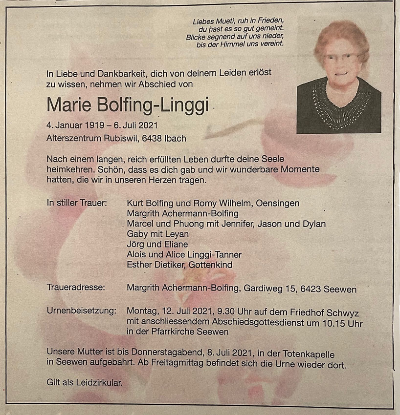 Anfangs Jahr feierte sie ihren 102. (!) Geburtstag, doch jetzt wurde sie vom Schöpfer heimgeholt. Die Familie der Verstorbenen und die Dorfgemeinschaft trauern um eine Mitbürgerin, die bis ins hohe Alter aktiv am Dorfleben und Zeitgeschehen teilnahm. Die letzten Jahre verbrachte Marie Bolfing im Alterszentrum 'Rubiswil' in Ibach. Wir sprechen unser herzliches Beileid aus.