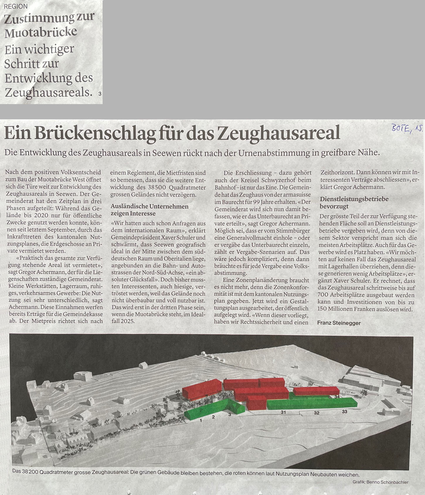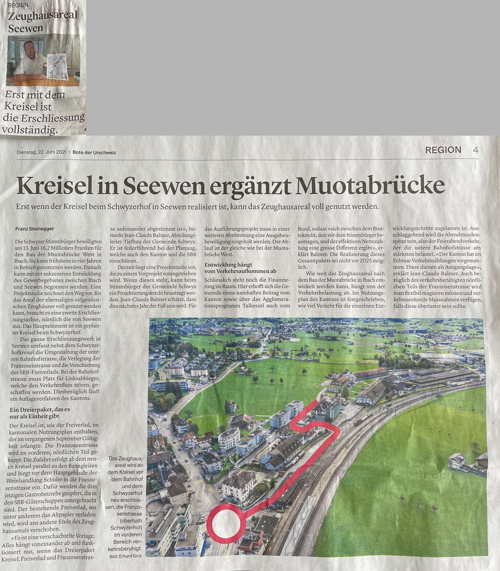 p. Gut Dinge will Weile haben. Diese Sprachwendung könnte nicht passender sein, wenn es um die Erschliessungsfrage 'ehemaliges Zeughaus Seewen-Schwyz' geht. Ueber 15 Jahre schon planen Planer (auf Kosten des Steuerzahlers), wie das riesige brach liegende Areal an das übergeordnete Strassennetz angebunden werden könnte. Jetzt ist die Lösung einen grossen Schritt vorangekommen. Mit einem Urnen-JA hat das Stimmvolk der Gemeinde am vergangenen Wochenende der Idee zugestimmt, das Zeughaus-Areal aus Richtung Süden zu erschliessen - mit der Idee einer Brücke über die Muota. Der 'Bote' hat in seiner Ausgabe vom 15. Juni das Ja analysiert und aufgezeigt, wie es jetzt weitergehen könnte: