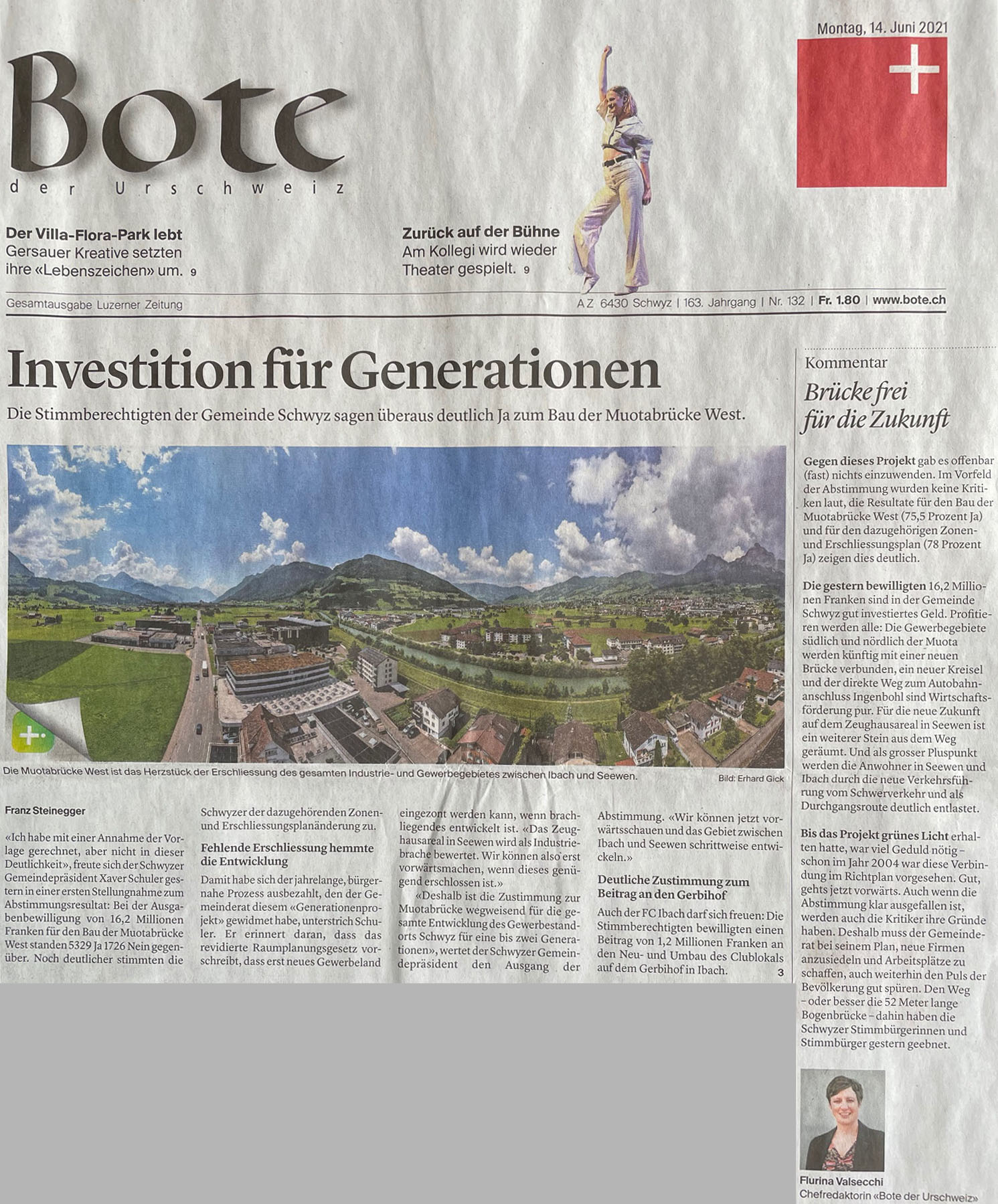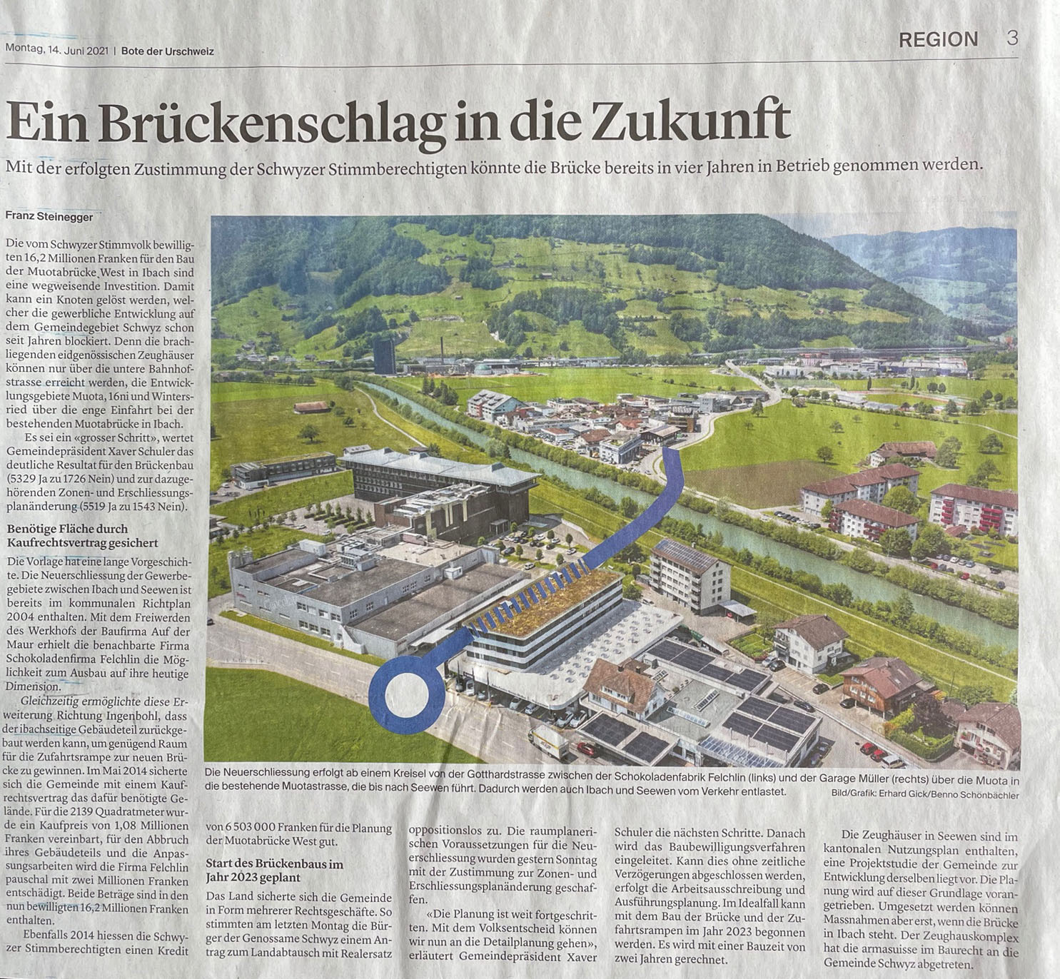 Das Stimmvolk hat dem Projekt 'neue Muotabrücke Ibach' zugestimmt, womit die Erschliessung des brach liegenden Areals des ehem. Eid. Zeughaus Seewen-Schwyz einen grossen Sprung nach vorne gemacht hat