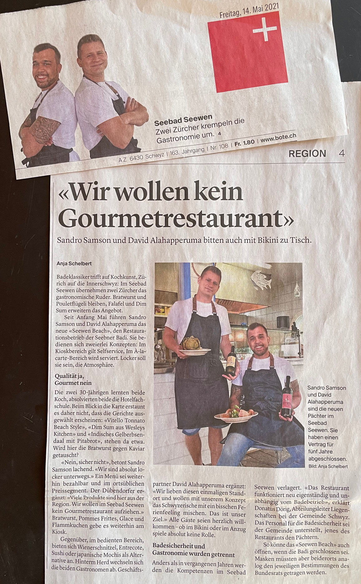 p. Die Badiareal-Eigentümerin, die Gemeinde Schwyz, hat Lehren gezogen. Sie will nach Jahren der 'Einheitsleitung Badi-Betrieb' die Badi neu aufsplitten: in einen eigentlichen 'Badebetrieb'-Teil und einen Teil 'Gastronomie'. Für letzteren suchte die Kommunalbehörde schon im Herbst Spezialisten. Sie fand sie in Sandro Samson und David Alahapperuma, beide aus Zürich (Wir berichteten darüber). Jetzt wurde klar, mit welchen Vorstellungen die beiden jungen Gastronomen das Schwyzer Publikum begeistern will. Gegenüber dem 'Bote der Urschweiz' verrieten sie ihr Rezept: