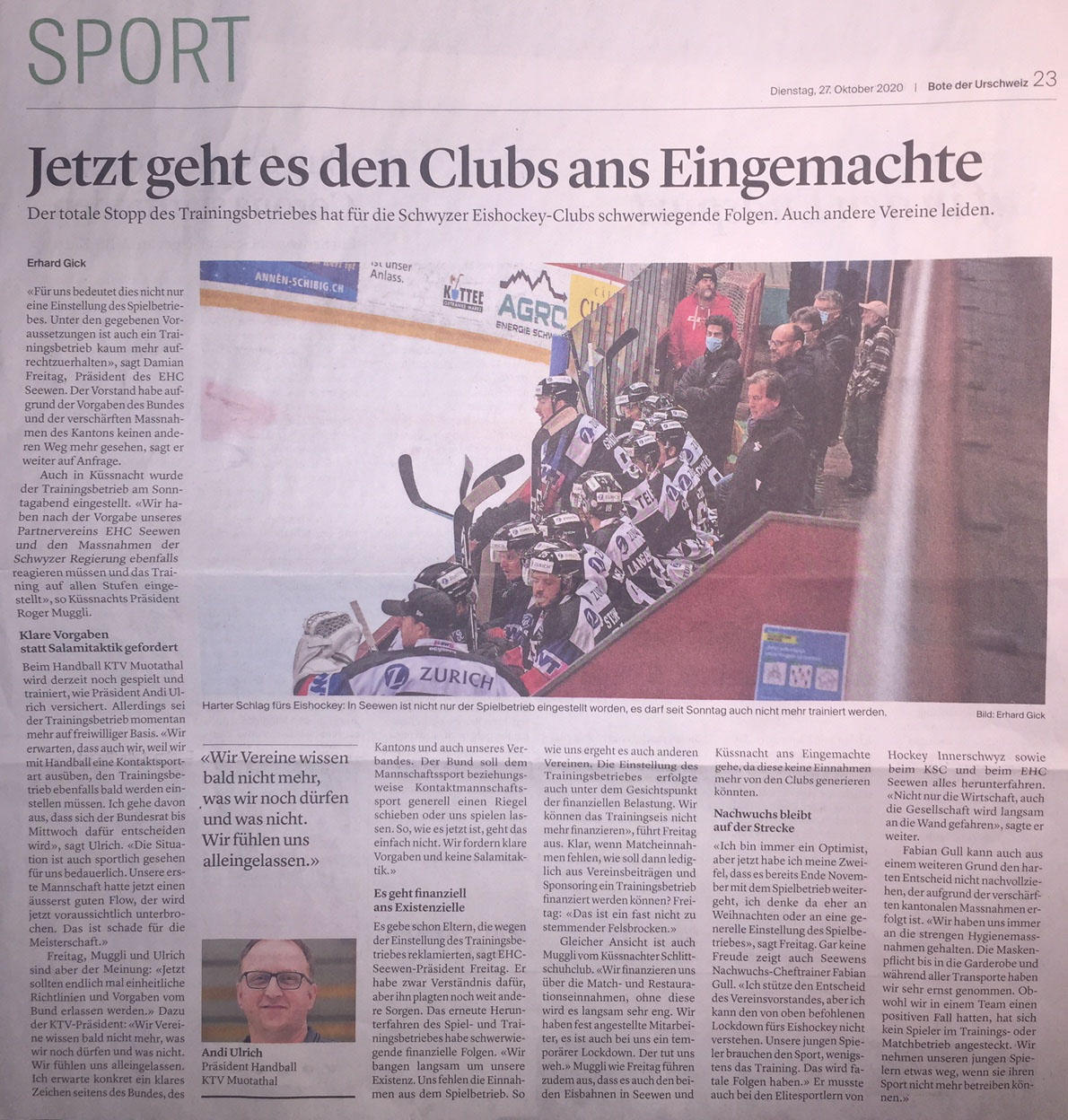 Virus ‘Corona’ bestimmt nach wie vor den Alltag. Auch das Leben in den Vereinen steht ganz im Zeichen des Lockdowns. Fast geht nichts mehr… Besonders vom ‘Rien-ne-va-plus’ aus Bern leidet der Sport, der Profis oder Halbprofis unter Vertrag hält und entlöhnen muss. Dorfbezogen betrifft dies der EHC Seewen, der – wie viele KMU’s – um die Existenz fürchtete. Dank staatlicher Zuschüsse aber konnte bislang das Schlimmste verhindert werden.
