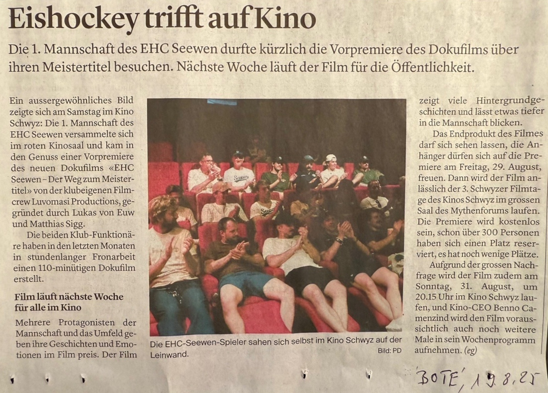 p. Es ist einzigartig, was die Mannen der ersten Mannschaft des EHC Seewen vergangene Saison auf dem Eis ergatterten: den Meistertitel in der höchsten Amateur-Eishockeyliga! In der 74-jährigen Vereinsgeschichte stellt dies ein Meilenstein dar. In einem spannenden Spiel gegen den EHC Arosa sicherten sich die Cracks den begehrten Titel in der MyHockey League. Das Playoff-Spiel gewannen die Schwyzer mit 4:0! Was gibt es Schöneres als diese Momente nochmals ‘nachzufühlen’? Die zwei Insider Lukas von Euw und Matthias Sigg haben die Sportler tagelang begleitet und die schönsten, emotionalsten Momente filmisch festgehalten. Vor einem ausgewählten Publikum wurde die Vorpremiere des Dokumentarfilms dieser Tage gezeigt… Derweil rüstet sich der Club bereits wieder auf die kommende Saison. In wenigen Tagen lädt der Verein zum traditionellen Nachwuchsturnier ein. Man darf gespannt sein, ob die Jungs auch einmal Meisterluft wittern können.