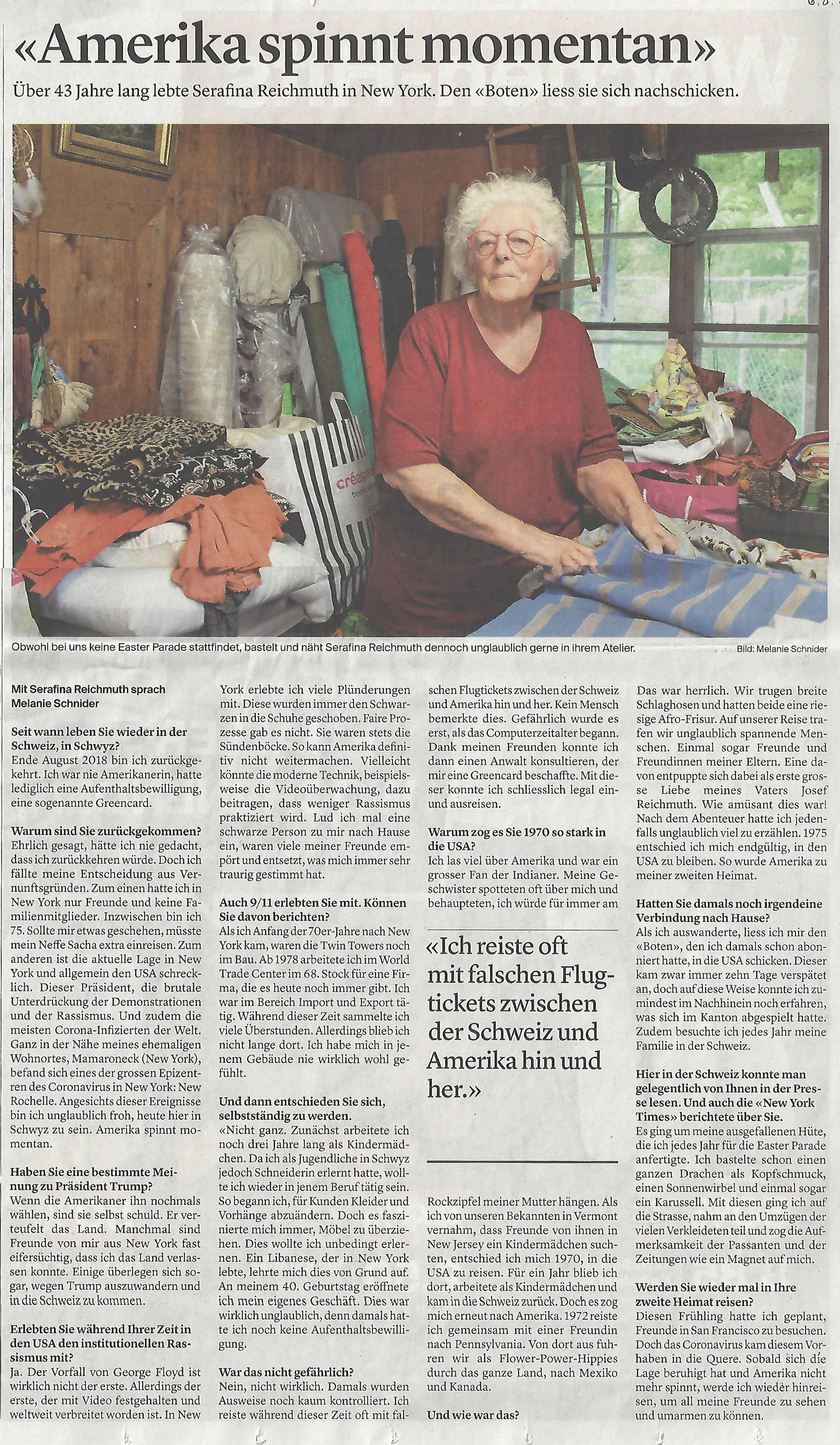 Der ‘Bote der Urschweiz’ interviewte die aus Amerika rückgekehrte Seebnerin in der Ausgabe vom 6. August 2020, was unserer Leserschaft ebenfalls nicht vorenthalten bleiben soll: