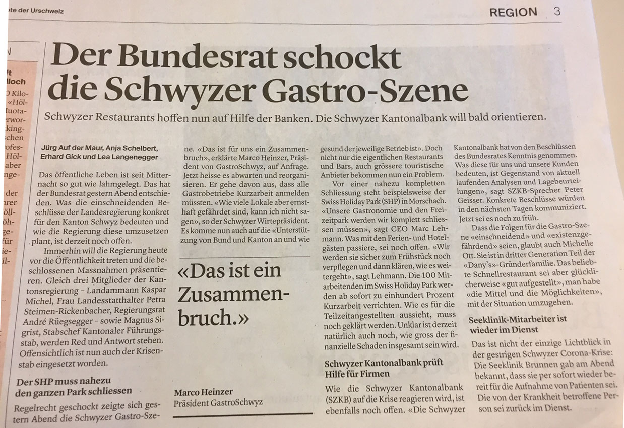 p. Unglaublich, was momentan auf dem Planeten Erde geschieht! Da ist im fernen China ein Virus aufgetaucht, der jetzt die ganze Welt in Atem hält. Auch hier im beschaulichen Seewen. Denn um die Ausbreitung des – in wenigen Fällen tödlich verlaufenden – Virus einzudämmen, hat die Schweizer Regierung drastische Massnahmen beschlossen. So sind seit Mitternacht (vom 16. auf den 17. März 2020) viele öffentliche und halböffentliche Stätten geschlossen worden. Das höchste Gebot der Stunde lautet: Schutz der Menschen! Hierzu sind dem Staat fast alle Mittel recht. Besonders von den Massnahmen betroffen sind die kleinen und mittleren Unternehmungen, die das Rückgrat der Schweizer Wirtschaft bilden. Merken tut dies die Bevölkerung, die nun im Alltag auf zahlreiche ‘Geschlossen’-Täfelchen trifft. Doch was soll Herr und Frau Schweizer bzw. Schwyzer tun? – Sich an die Verordnungen halten. Der Bund hat extra eine Hotline eingerichtet. Diese lautet: