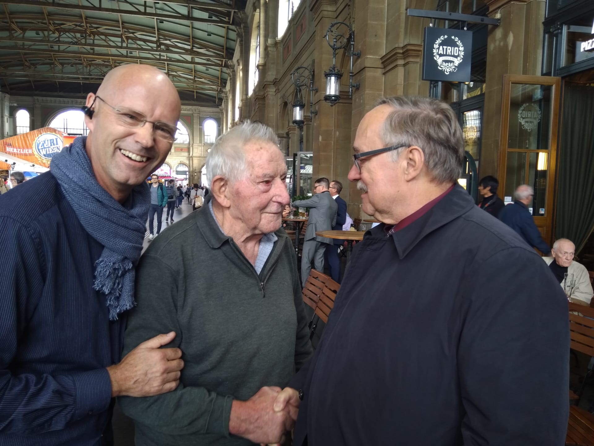 p. Der Wahlkampf für einen Platz in der ‘Schaltzentrale der Politik’, dem Bundeshaus in Bern, treibt immer mehr Blüten. Gerüchte werden gestreut, Päckli geschnürt und nicht-protokollierte Treffen vereinbart. Ein solches fand gestern Mittwoch (25.9.19) im Zürcher Hauptbahnhof statt. Im Fokus: die beiden Vollblutpolitfüchse Wysel Inderbitzin (Jahrgang 1927) und Sämi Schmid (JG 1947), Bundesrat der BDP bis 2008. Gesichtet wurden sie vom Seebner Dorfhistoriker Peter Rickenbacher. Er ‘ertappte’ sie während ihrer angeregten Diskussionen zu allen möglichen Themen des Lebens wie heiraten, Kinder kriegen und altern. Das Gespräch fand inmitten hunderter Passanten statt, direkt vor der Pizzeria & Bar Atrio. Beide duzten sich, der ehemals hohe Magistrat war tief beeindruckt vom Politwissen und der Lebenserfahrung des Berglers. Nicht verraten wollten die beiden, ob Wysel für einen Sitz im National- oder Ständerat kandidieren wird. Bekanntlich finden am 20. Oktober die Erneuerungswahlen beider Kammern statt. Den Schnappschuss im Hauptbahnhof Zürich gelang einer Passantin und zeigt die drei gut gelaunten Herren Rickenbacher, Inderbitzin und Schmid.