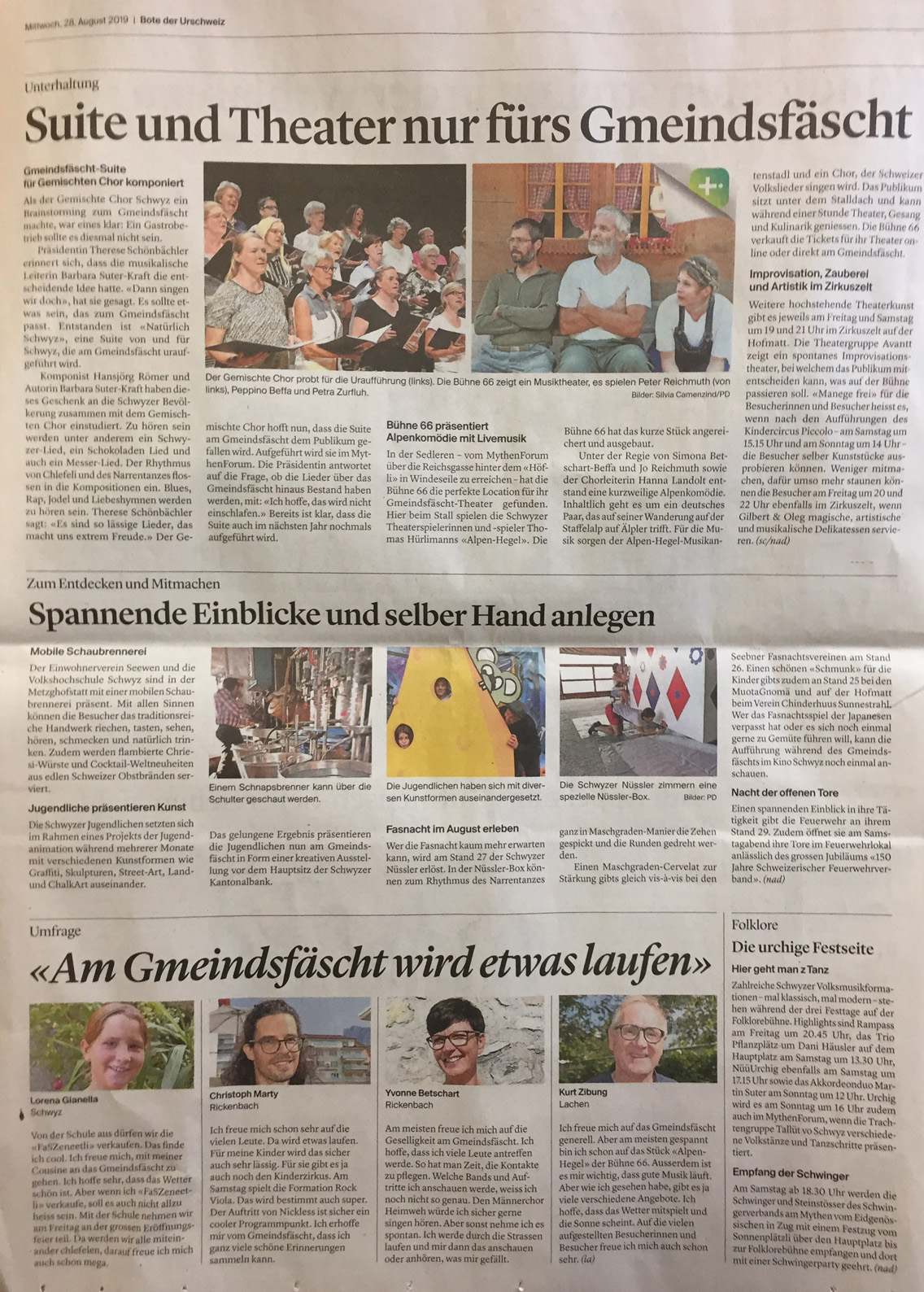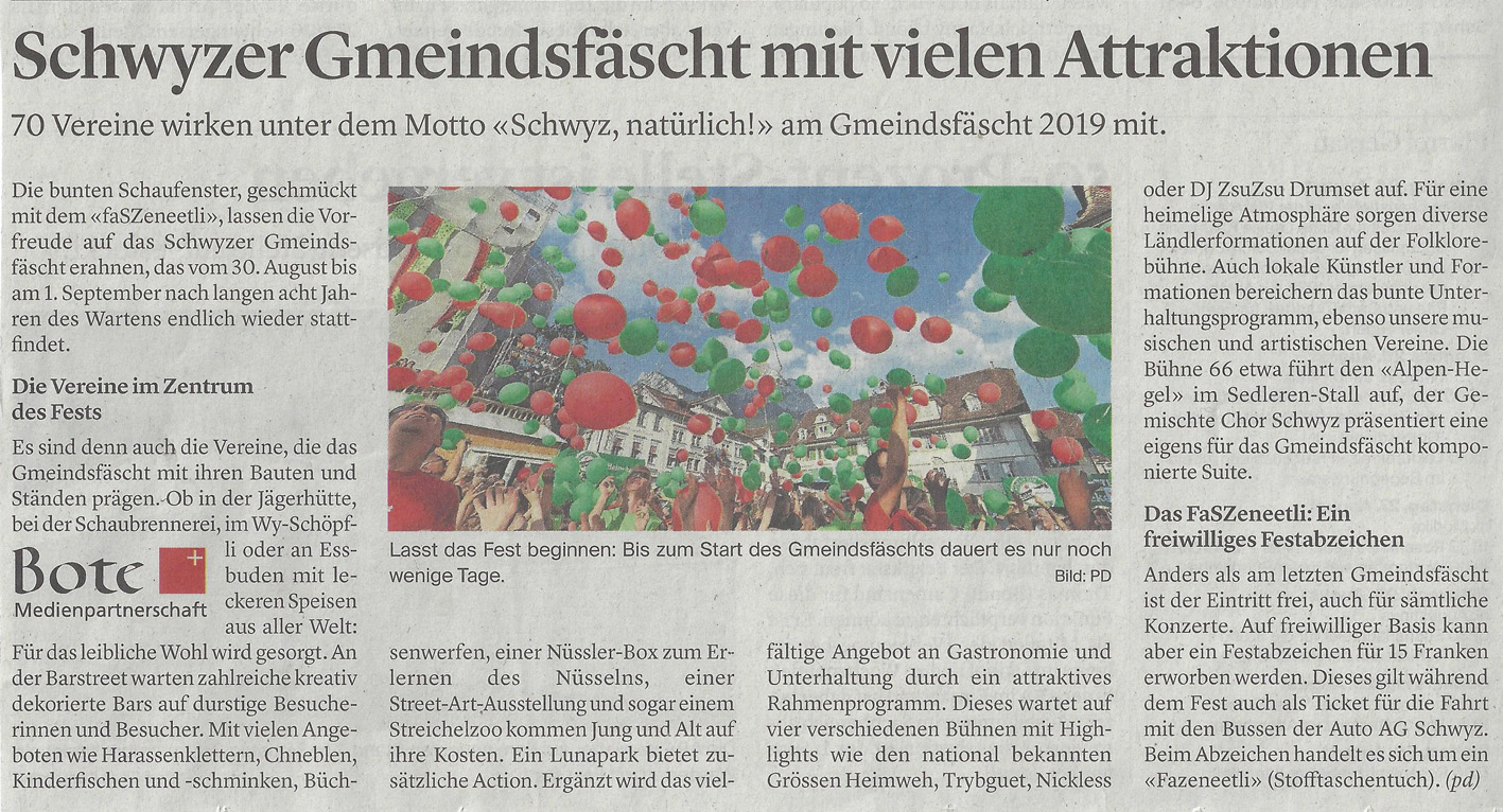 Im 'Bote der Urschweiz' vom 28.8.2019 war nochmals eine ausführliche Vorschau zum anstehenden Gmeindsfäscht in Schwyz abgedruckt. (Beachten Sie die Beiträge über die Seebner Vereine!)