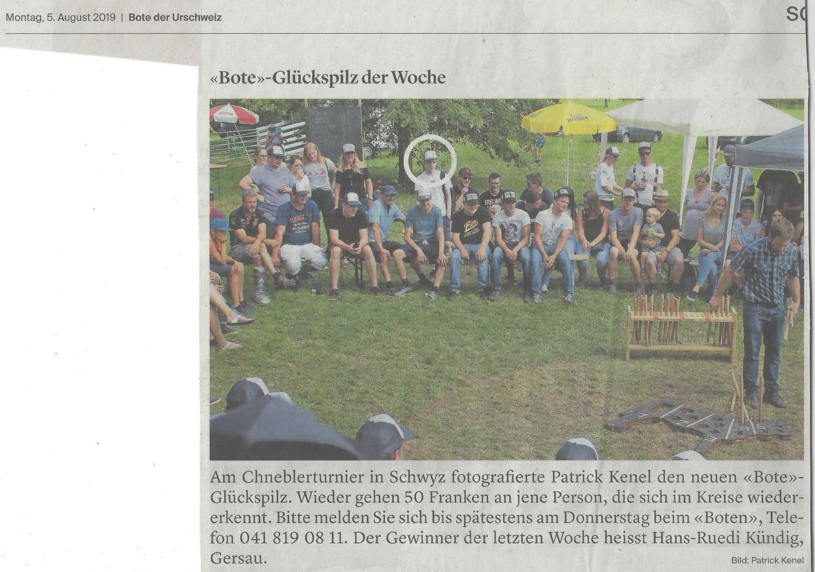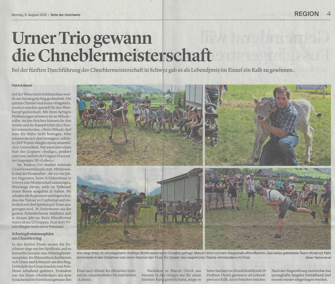 p. Kaum ein Seebner Jugendlicher, der nicht weiss, was ‘chnelbä’ heisst. In den Sommerlagern oder in ‘Höcks’ der Jungwächter ist es ein MUSS, sich mit diesem alten Spiel zu vergnügen. Wer ‘es’ einmal probiert hat, der kommt immer wieder darauf zurück. Denn mit ‘chnebeln’ die andern Spielteilnehmer zu ‘versenken’ hat nicht nur mit Kraft zu tun… In Schwyz fand am Samstag zum bereits vierten Mal ein Wettkampf in dieser Sparte statt. Als Sieger hervor ging – ein Seebner! Im ‘Bote der Urschweiz’ vom 5.8.2019 wurde ausführlich über den Wettkampf berichtet: