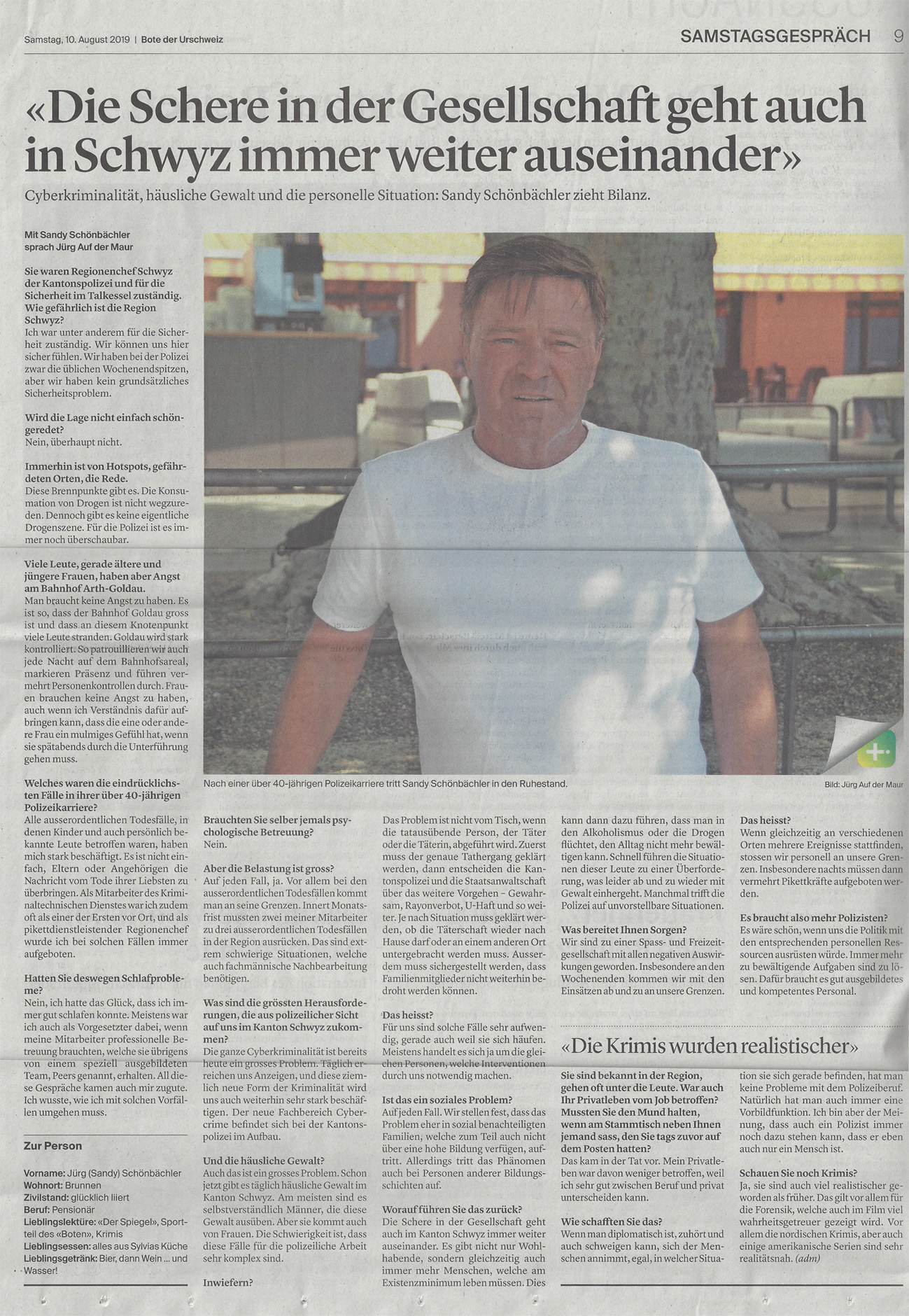 p. Alle nennen und kennen ihn als ‘Sandy’. Doch heissen tut er Jürg, Jürg Schönbächler. Aufgewachsen im Hause ‘Löwen’ in Unterseewen hat sich der Sohn des ehemaligen Briefträgers Walter und der Anni Aufdermaur vom nahen ‘Bauernhof’ schon früh für den Polizisten-Beruf interessiert. Jetzt, über 40 Jahre später im Dienste der Allgemeinheit, hat er sich vorzeitig pensionieren lassen. Im Samstagsgespräch des ‘Bote der Urschweiz’ vom 10.8.2019 blickt er auf die Veränderungen, die er als Polizist in den letzten vier Jahrzehnten erlebt hat, zurück: