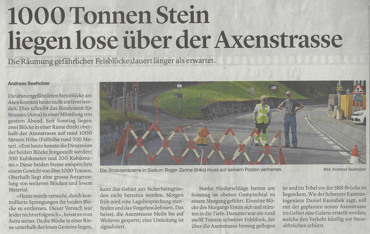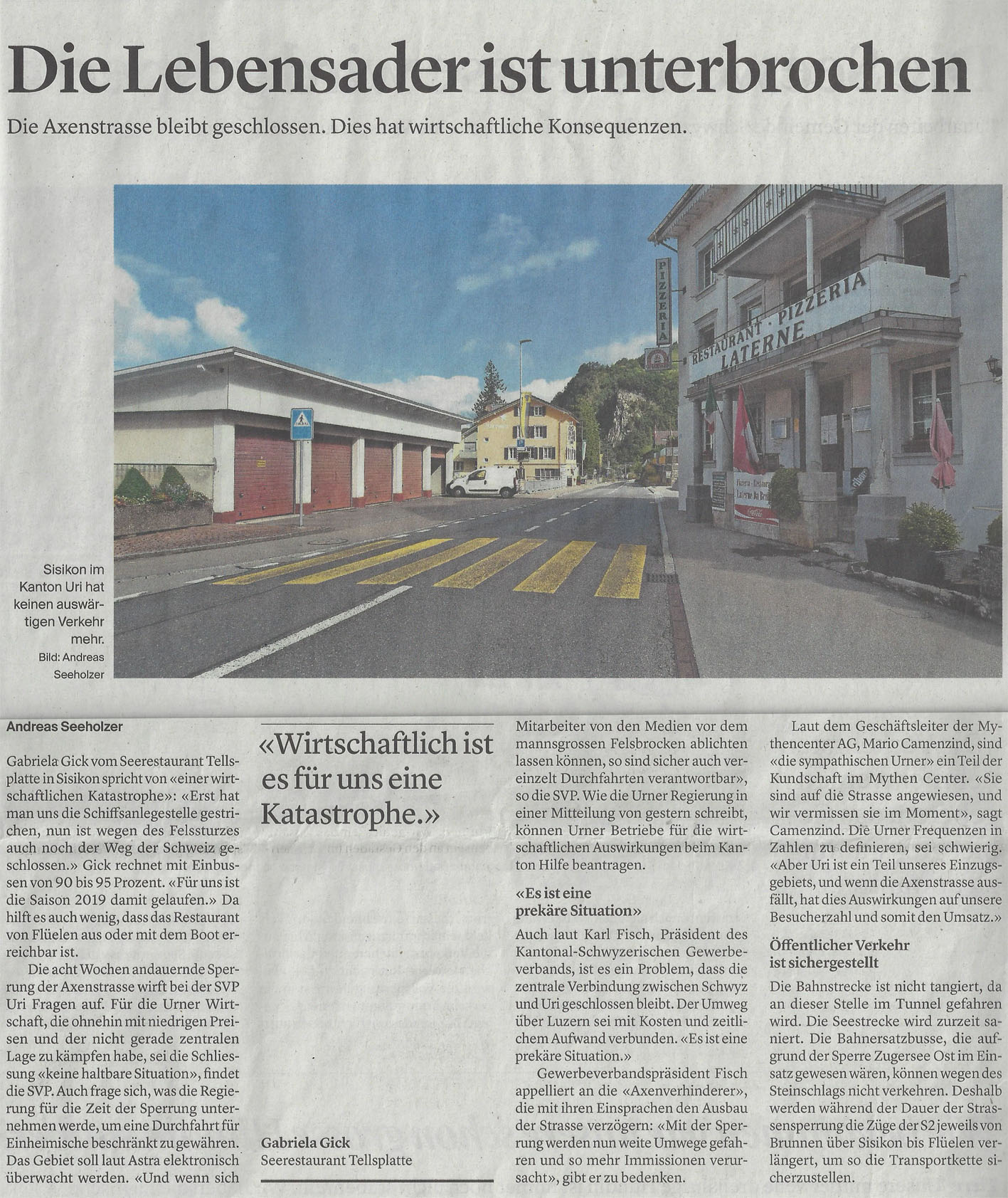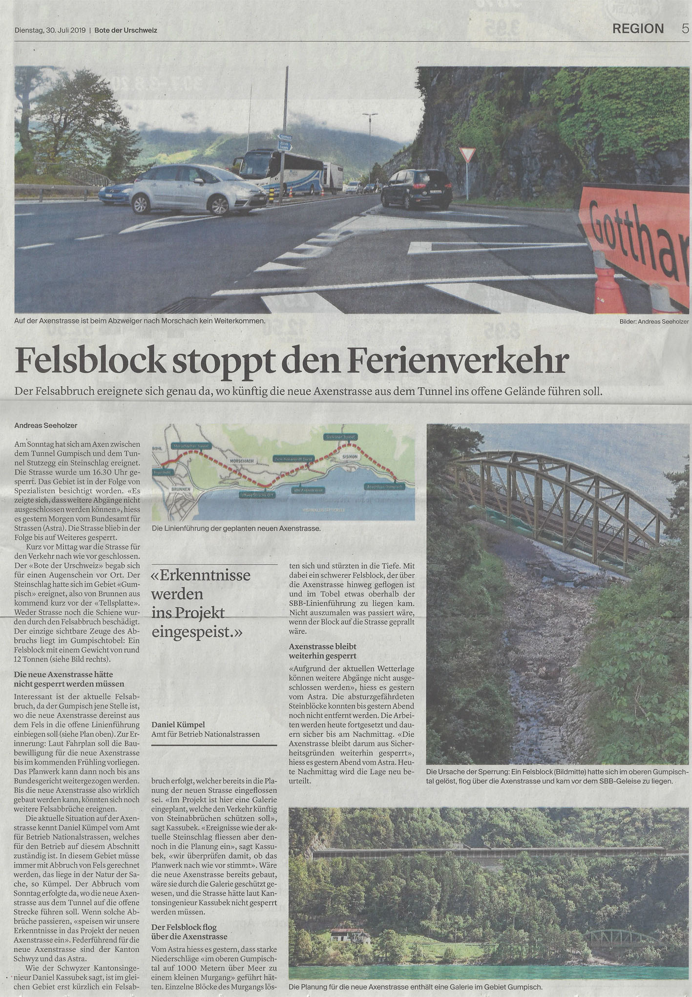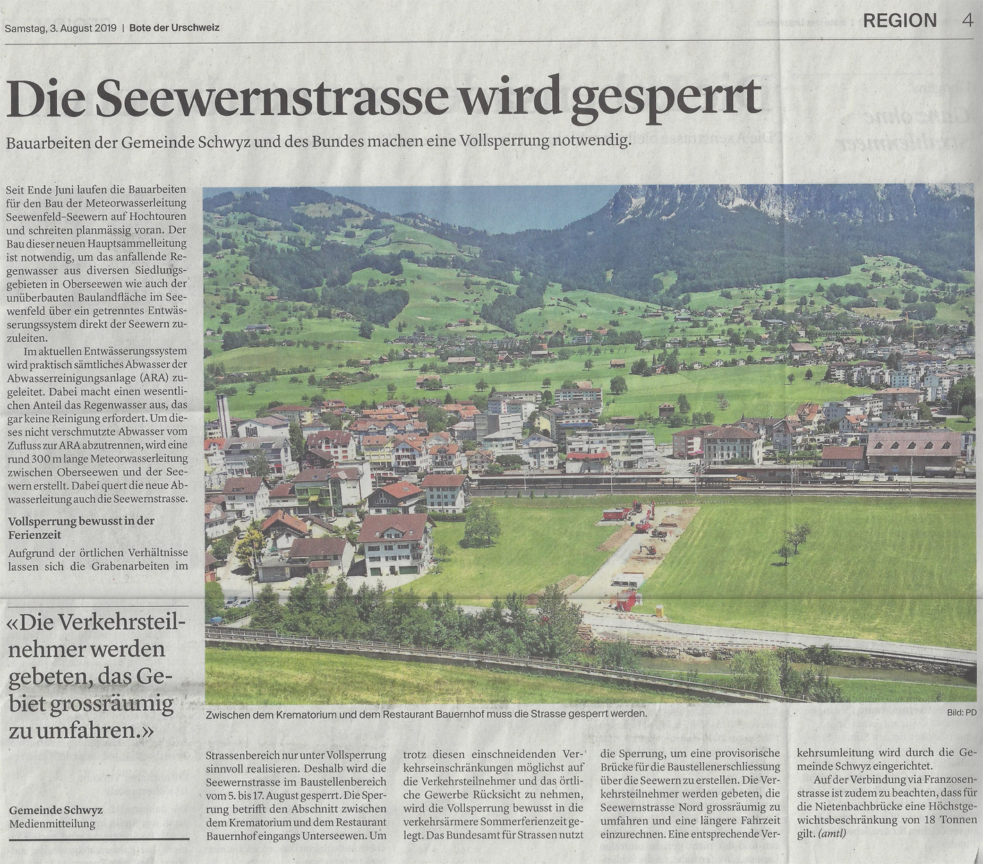Der ‘Bote der Urschweiz’ berichtete am 3. August 2019 über die anstehende Totalsperre der Seewernstrasse: