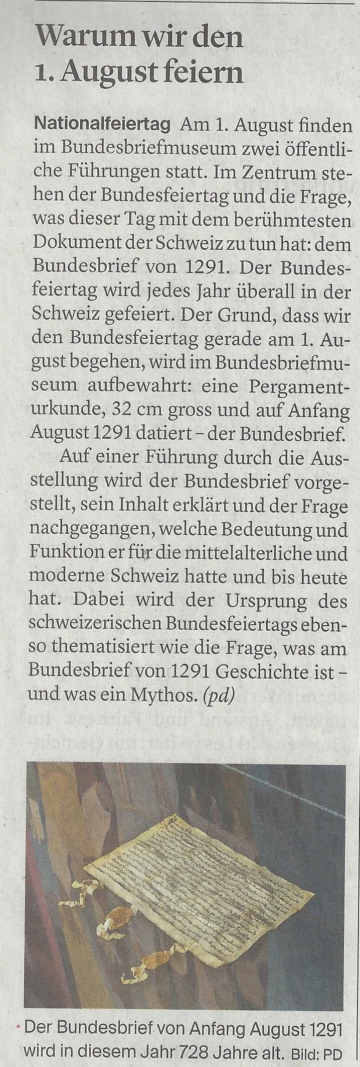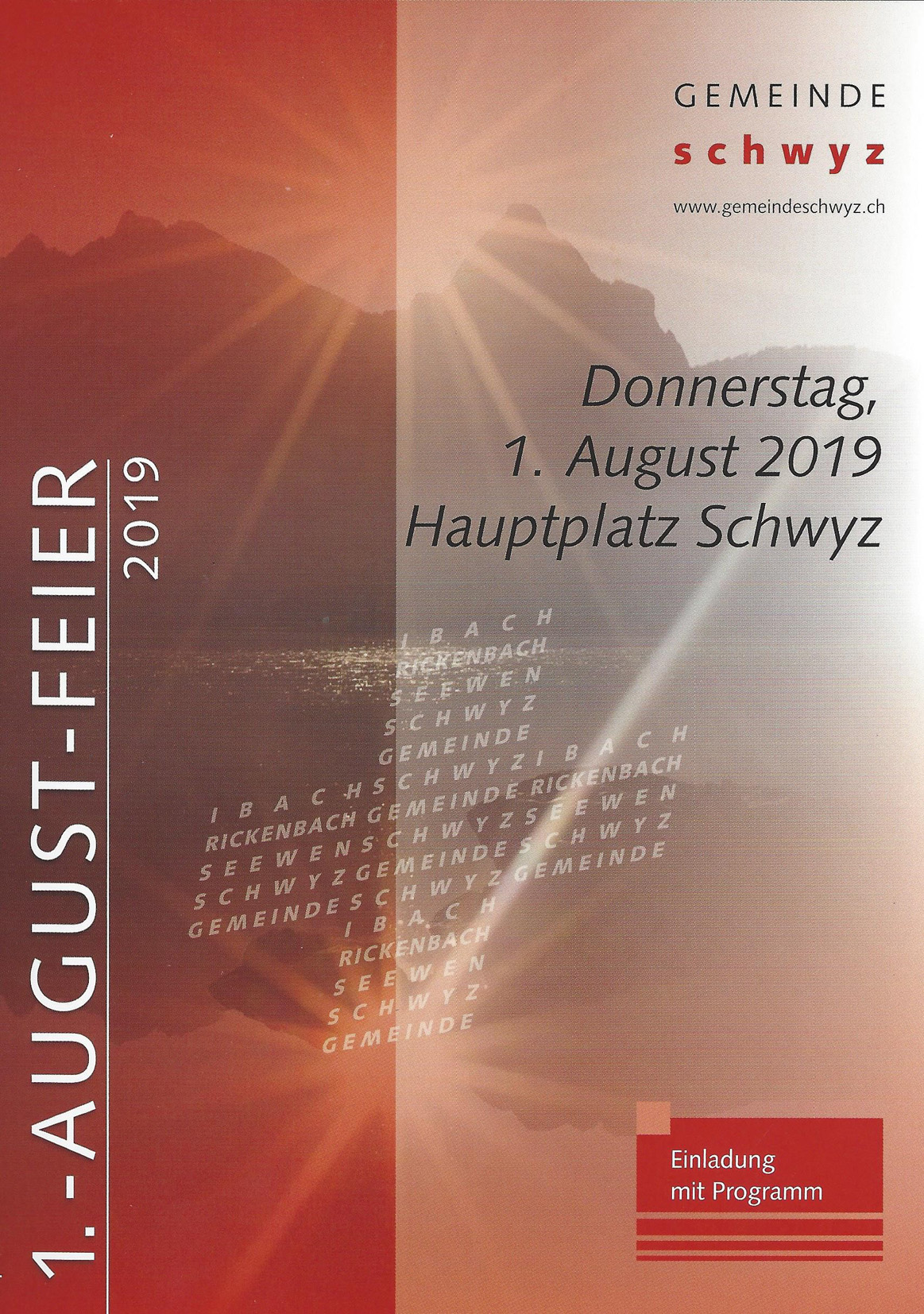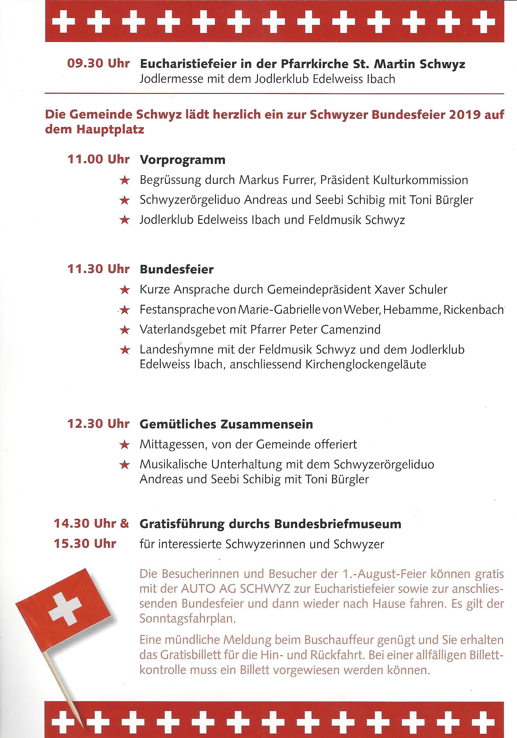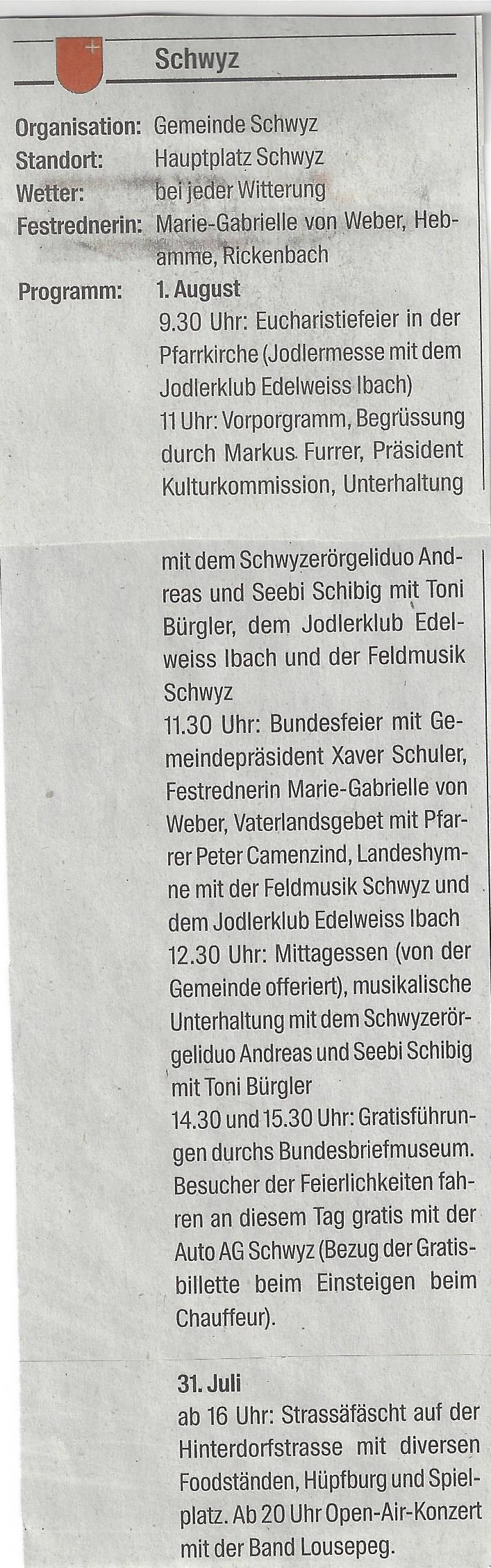 p. Wie überall in der restlichen Schweiz finden am 1. August auch hier im Schwyzerland allerlei Festivitäten zum Geburtstag der Eidgenossenschaft statt. Mit Inseraten, Flyern und auf Social-Media-Kanälen machen Veranstalter auf ihre Aktivitäten aufmerksam in der Hoffnung, dass ihre Angebote in Anspruch genommen werden. Alle rechnen dabei mit guter Witterung, finden die Veranstaltungen doch meist unter freiem Himmel statt. Eine dieser Feiern organisiert ein OK auftrags der Gemeinde Schwyz. In Abwechslung mit den Filialen Ibach, Rickenbach und Seewen wird die Gemeindefeier alle zwei Jahre im Hauptort gefeiert. Dies ist heuer der Fall. Das Flugblatt zur diesjährigen Feier ist allen Haushaltungen der Gemeinde zugestellt worden. Darauf findet sich u.a. ein Vorprogramm und dann das eigentliche Programm mit Begrüssungsworten des Gemeindepräsidenten um 11.30 Uhr. Es folgen die Festansprache von Hebamme Marie-Gabrielle von Weber, das Vaterlandsgebet mit Pfarrer Peter Camenzind und der Vortrag der Landeshymne mit Feldmusik Schwyz und dem ‘Jodlerklub Edelweiss Ibach’. Im Anschluss an den offiziellen Festakt offeriert die Gemeinde ein Gratis-Zmittag und ab 14.30 Uhr Gratisführungen durchs Bundesbriefmuseum.
