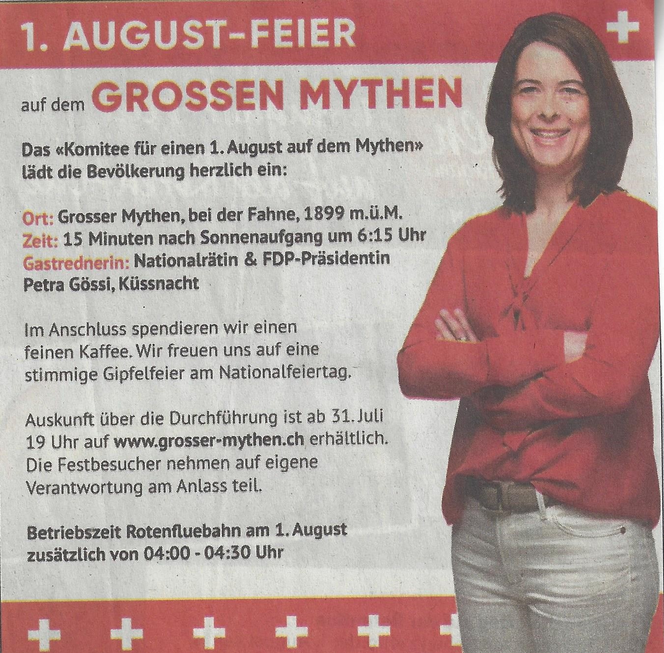 Wer die offizielle Gemeinde-1.-August-Feier nicht erwarten kann, der hat bereits frühmorgens Gelegenheit, einer 1. August-Feier beizuwohnen. Das ‚Komitee für einen 1. August auf dem Mythen’ lädt die bergfreudige Bevölkerung ein, den Staatsgeburtstag schon bei Sonnenaufgang zu feiern. Als Gastrednerin wirkt heuer zum ersten Mal Nationalrätin Petra Gössi aus Küssnacht.