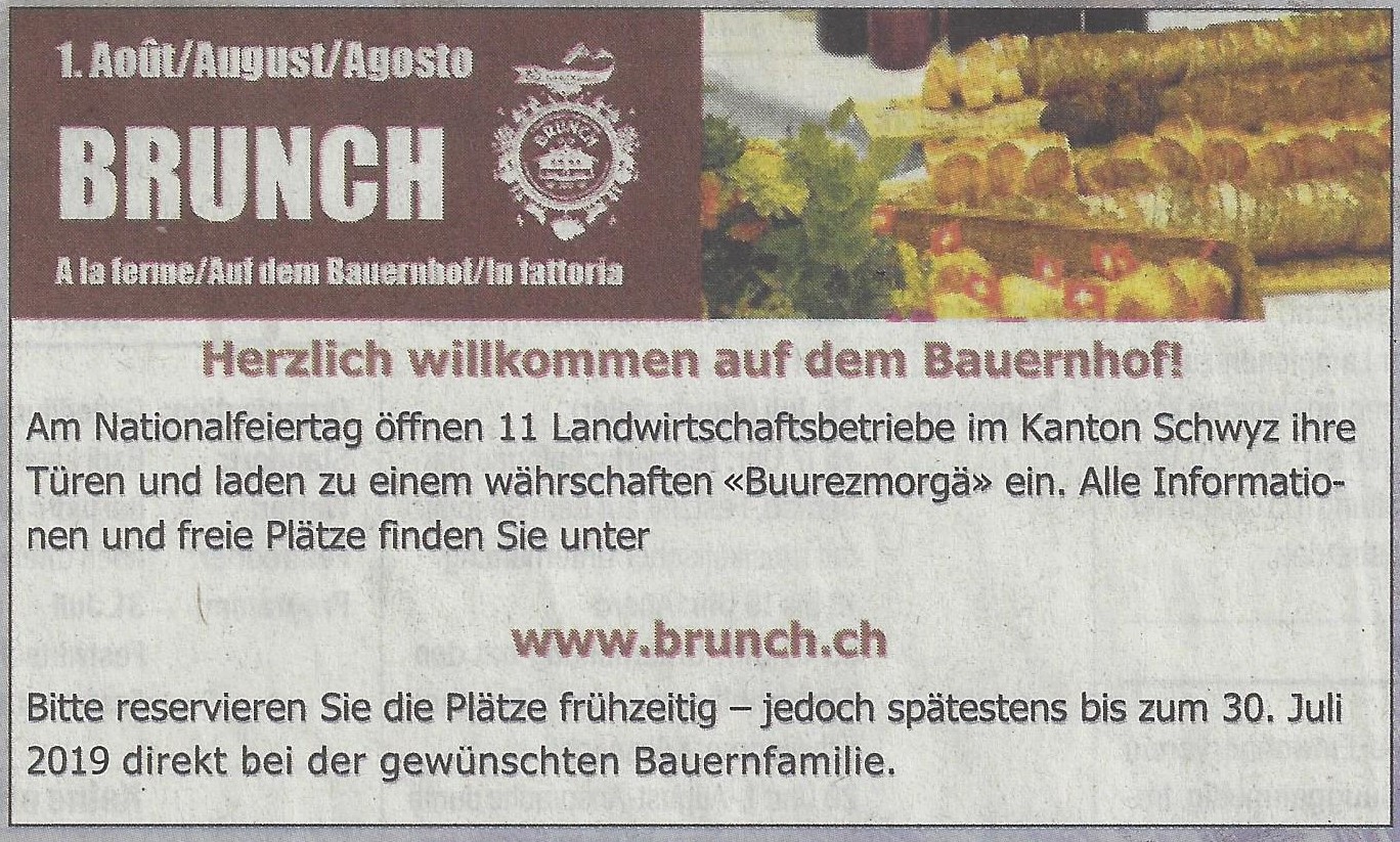 Fast zeitgleich zur offiziellen Bundesfeier der Gemeinde laden landauf landab zahlreiche Bauernbetriebe zum ‘Buuräbrunch’ ein. Auf ihren angestammten Schollen wird aufgetischt, was der Hof hergibt. Auf Seebner Hoheitsgebiet macht Barbara Suter vom ‘Hof Engelstock’ mit – an schönster Aussichtslage. Infos dazu auf: