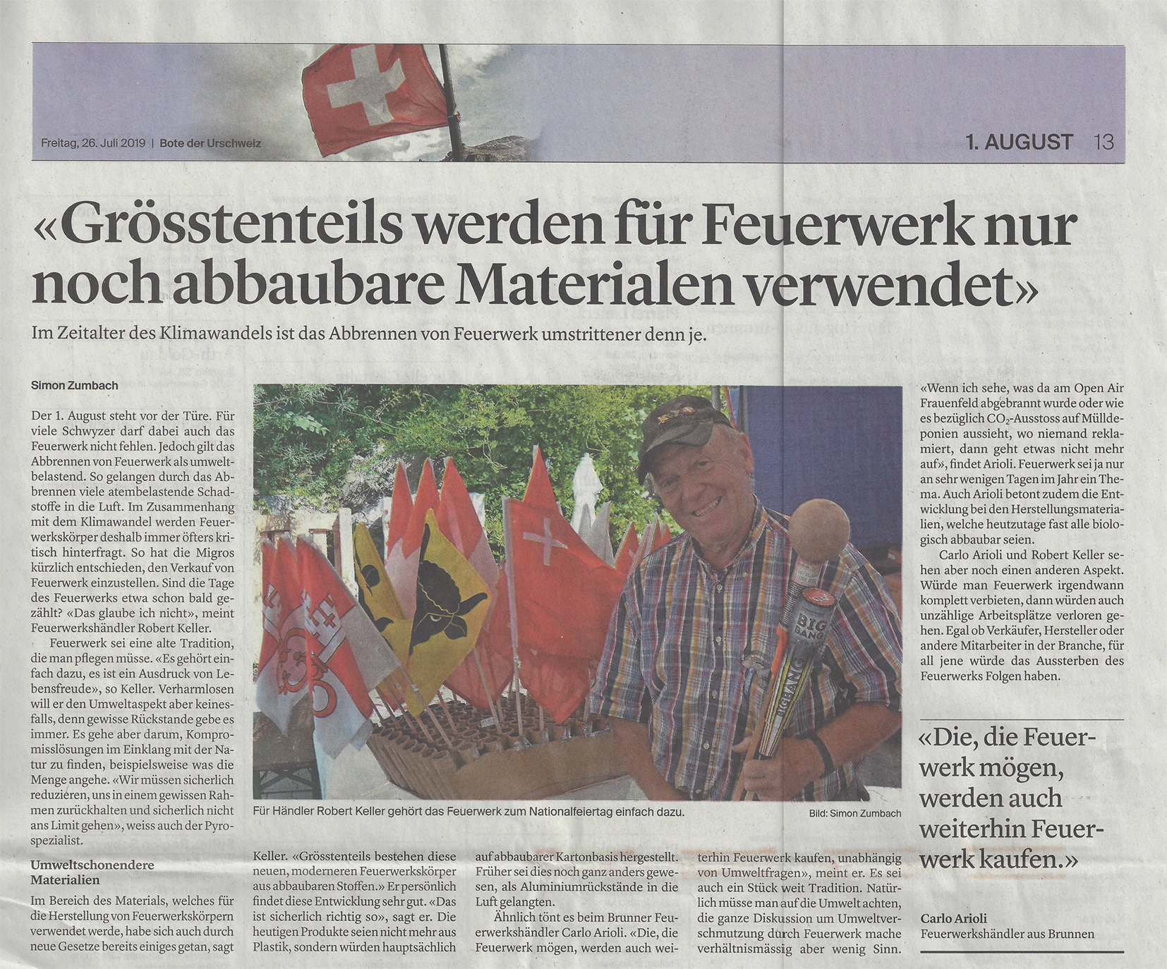Das Thema ‘Klimaerwärmung’ hat auch die Diskussion um das Abbrennen von Feuerwerk ‘befeuert’. Der Ur-Seebner Röbi Keller hat im ‘Bote der Urschweiz’ vom 26. Juli 2019 wie folgt Position bezogen: