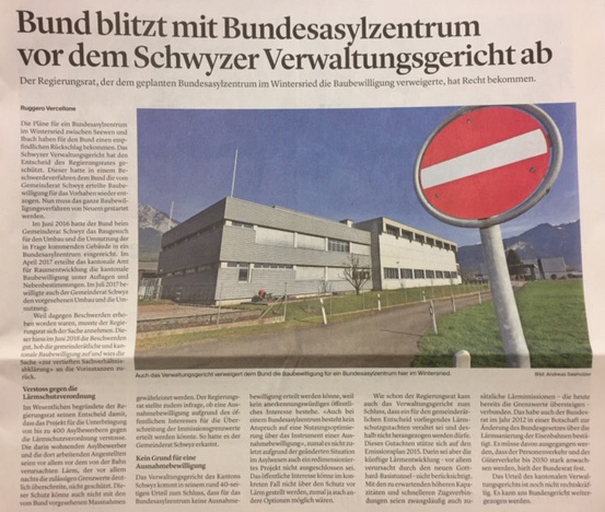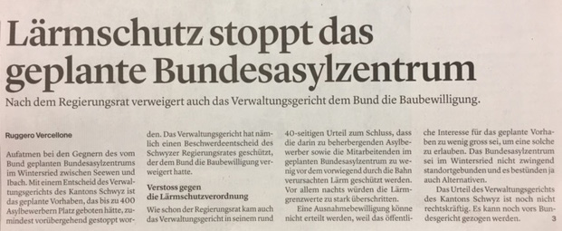Nun haben die Gegner wieder moralische Oberhand erlangt. Das Schwyzer Verwaltungsgericht hat nämlich entschieden, dass die Züge der nahen Eisenbahnstrecke für Asylbewerber und Betreuungspersonal ‘zu laut’ seien, um das Projekt bewilligen zu können…