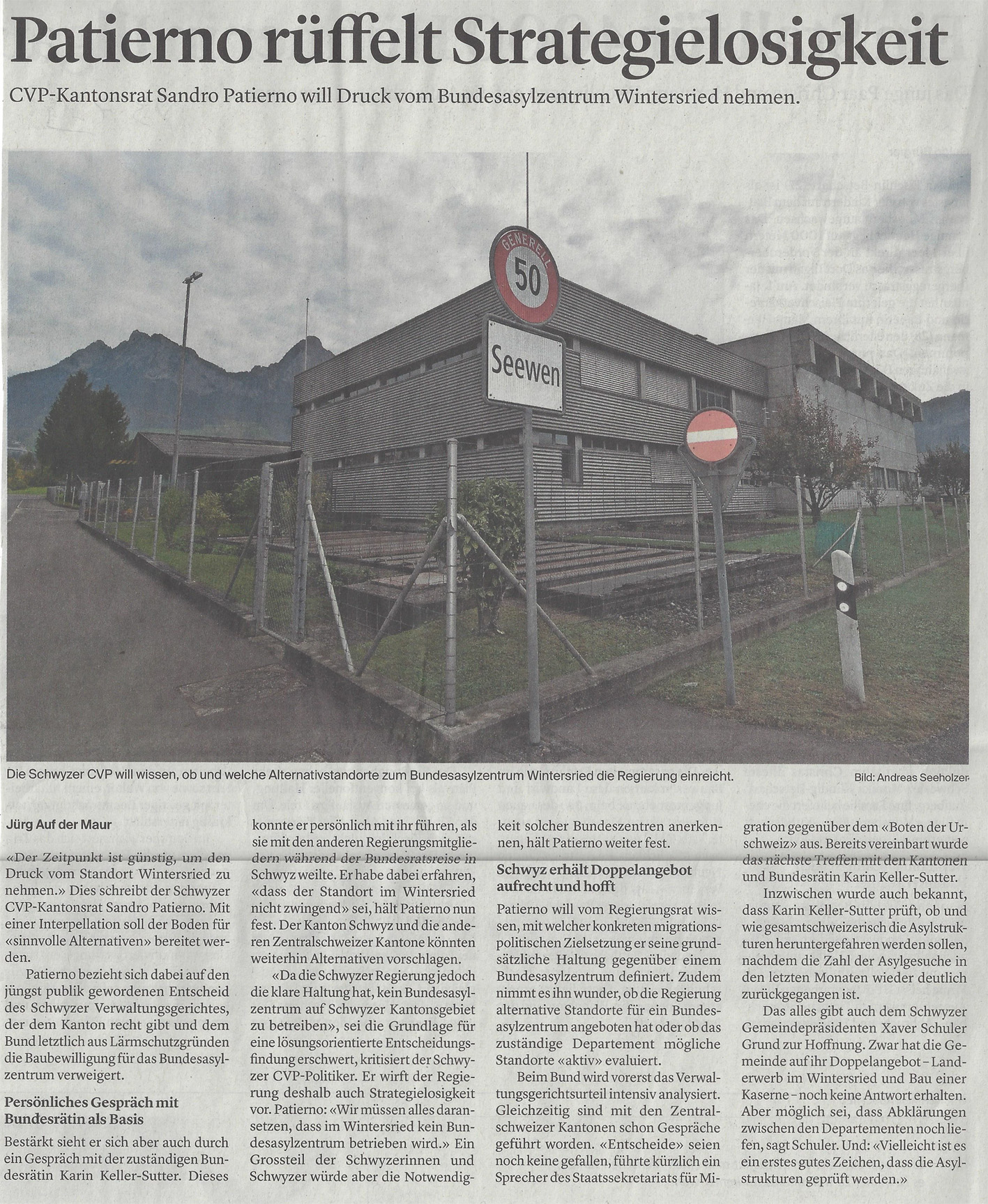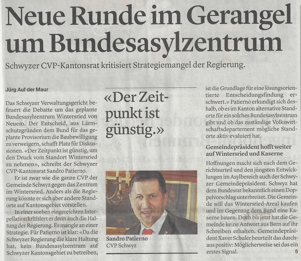 p. Erst sagte der Gemeinderat Schwyz Ja zu einem Ausschaffungszentrum für abgewiesene Asylbewerber, dann kam das Veto der Schwyzer Regierung. Begründet wurde das Nein mit raumplanerischen Argumenten (‘liegt in der Entwicklungsachse Urmiberg’). Es kamen plötzlich Alternativstandorte in die Diskussion. Und die Justiz. Seit Jahren streiten sich nun allerlei Parteien um die immer gleiche Frage: ‘Braucht es das geplante Bundesasylzentrum für Ausschaffungsflüchtlinge im Wintersried zwischen Seewen und Ibach wirklich?