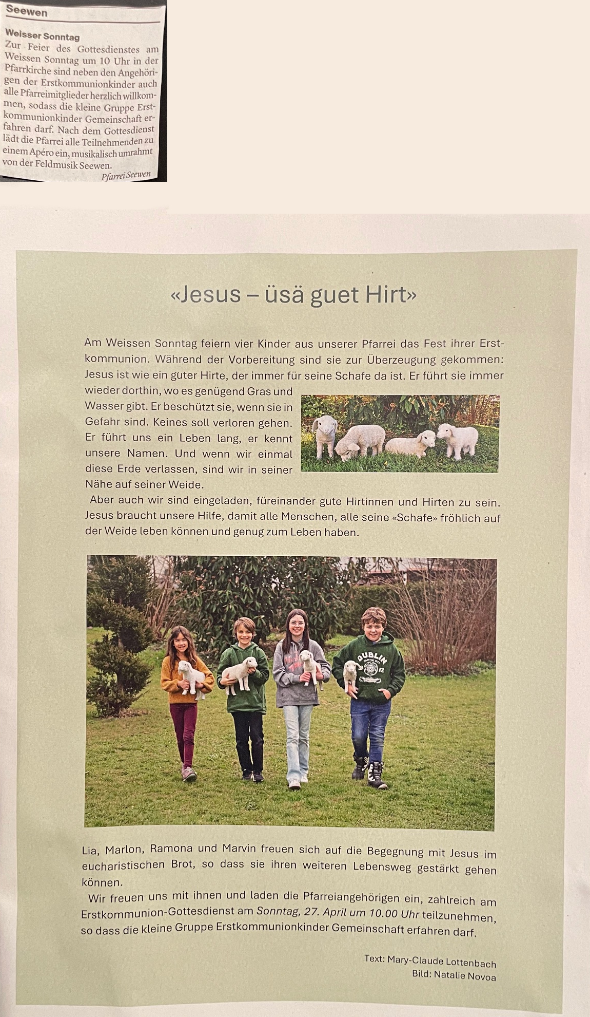 p. Ja, die geburtenstarken Jahrgänge sind - auch in Seewen - längst Vergangenheit. Schulklassen mit gegen 40 Schülerinnen und Schülern (Jahrgänge 1962, 63, 64, 65, 66 usw.) wurden erst je auf zwei Klassen pro Jahrgang aufgeteilt, dann sukzessive mit fallenden Schülerzahlen wieder als Einzelklasse gelistet. Parallel hat auch die Zahl der Gläubigen von Jahr zu Jahr abgenommen. Besonders römisch-katholische Christen gibt es in Seewen immer weniger. Direkt feststellen kann man dies an den Zahlen der Kirchgänger, und der Religionsunterricht-Teilnehmer/innen. So verwundert es nicht, dass immer weniger Katholiken das heilige Sakrament der Erstkommunion am Weissen Sonntag empfangen. In Seewen werden es heuer gerade mal noch genau 4 (!) Gläubige sein...