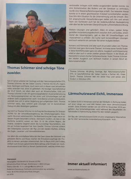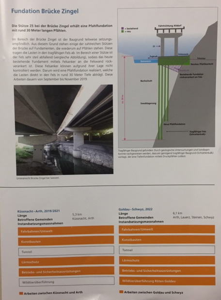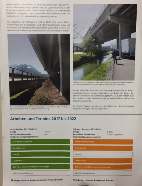 p. Sie ist unübersehbar für alle Passanten, die sich irgendwie im Grossraum Unterseewen aufhalten: die Baustelle ‘Autobahn A4’. Seit Wochen sind dutzende von orange gekleideten Männern mit ‘Baustellen-Installationsarbeiten’ beschäftigt. So werden hunderte Meter Gerüste aufgestellt, eine Hilfsbrücke über die Seewern erstellt und Notsträsschen und -Plätze für den Werkverkehr und die Lagerung von Baumaterial gebaut. Ueber den genauen Baufortschritt und das eigentliche Bauvorhaben informiert die Bauherrschaft, die ASTRA heisst. Sie lässt in regelmässigen Abständen ein ‘Flugblatt’ in die Haushaltungen verteilen, sodass mindestens die Nachbarschaft weiss, was ‘Sache ist’. Das jüngste Blättchen heisst ‘info4’ und enthält folgende Angaben: