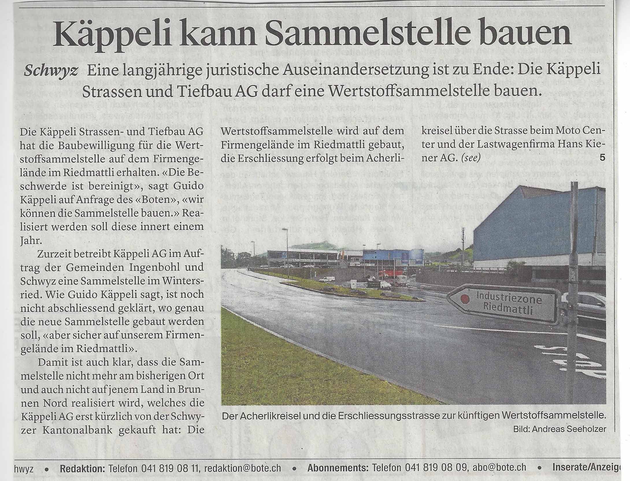 p. Sie gehört zu einer Gruppe mehrerer Bauwilliger, die Bauunternehmung Käppeli. Die im ‘Riedmattli’ beheimatete Strassenbaufirma versucht – wie andere Firmen auch – eine Baubewilligung für ihre geplante Wertstoffsammelstelle am westlichen Seebner Dorfrand zu erlangen. Das Prozedere dafür begann vor über zehn Jahren. Dass es damals nicht gleich mit einem behördlichen ‘Ja’ geklappt hat, dafür waren u.a. Nachbarn ‘zuständig’. Sie reklamierten die Erschliessungskapazität auf der zu- bzw. wegführenden Strasse (Schützenhausweg von/zu Bahnhofstrasse) und riefen dabei die Gerichte an. Jetzt hat mindestens eine der bauwilligen Firmen ein Okay bekommen. Wie der ‘Bote der Urschweiz’ weiss und am 13. Juni 2019 seiner Leserschaft bekanntgab, hat die Bauunternehmung eine rechtskräftige Baubewilligung für die Realisierung einer Wertstoffsammelstelle in der Industriezone ‘Riedmattli’ erlangt. Ob das ursprüngliche Vorhaben aber tatsächlich auch in Seewen gebaut wird, ist unklar, wie Firmenchef Guido Käppeli verriet. Zwischenzeitlich nämlich konnte die Firma einen ‘Blätz Land’ in Ingenbohl kaufen. Auch hier hätte es Platz für eine Sammelstelle…
