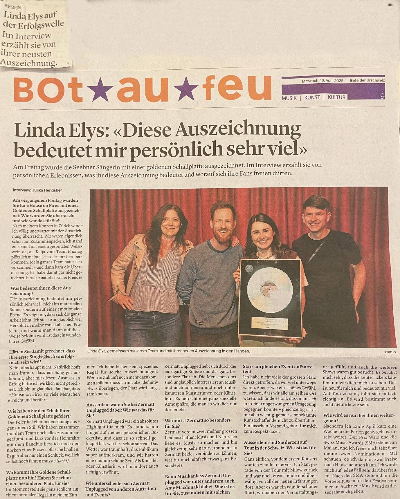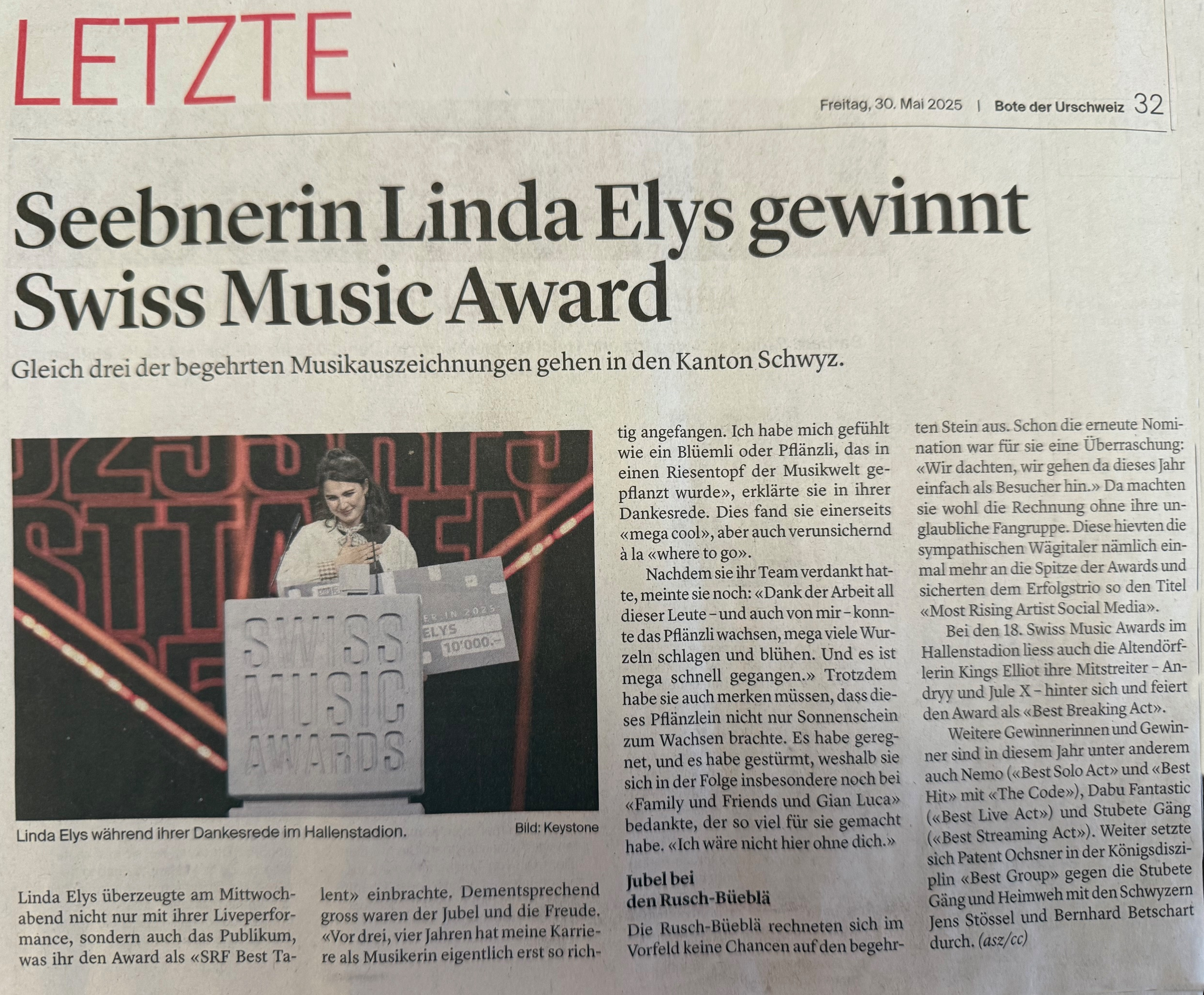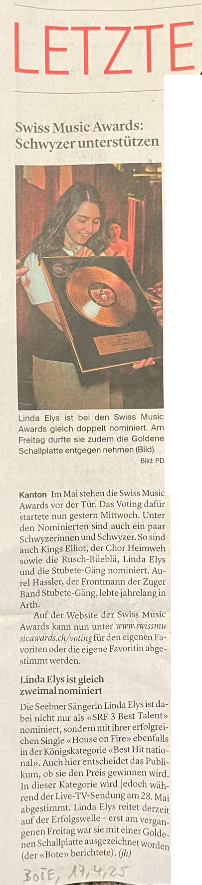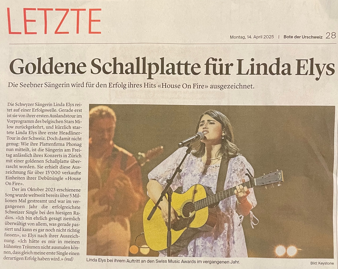 p. Wird ein Song von über 5 Millionen Mal gestreamt, dann hat man Vieles richtig gemacht! Linda Elsener, 'unsere' Sängerin aus Seewen, darf Stolz auf sich sein! Für ihren Hit 'House on Fire' wurde sie jüngst ausgezeichnet. Und nominiert für den 'Swiss Music Awards (SMA), welcher am 28. Mai durchgeführt wird, ist sie auch. Kurzum, das junge Talent ist in der Liga der Top-Musikerinnen längst keine Unbekannt mehr...Der 'Bote der Urschweiz' widmete der Seebnerin gleich mehrere Artikel: