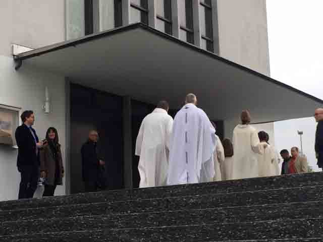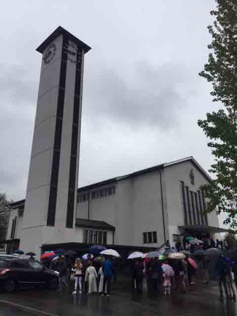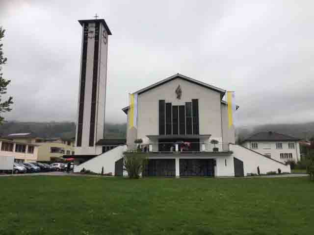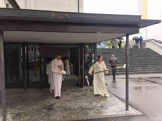 Wettergott 'Petrus' meinte es mit den Seebner Erstkommunikaten nicht so gut, er liess die Regenschleusen offen. Daher wurde auf den feierlichen Einzug vom Schulhaus 'Krummfeld' zur Pfarrkirche verzichtet. Trotzdem reichte es kurz vor dem Gottesdienst zu einem 'Gruppenbild' mit Pfarrer Reto Müller, Gemeindeleiter Koni Schelbert und Katechet Urs Betschart: