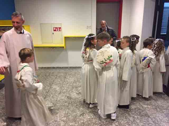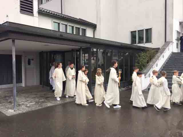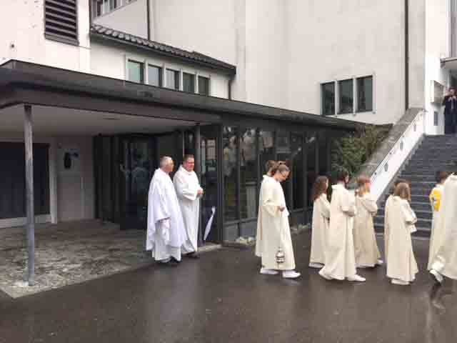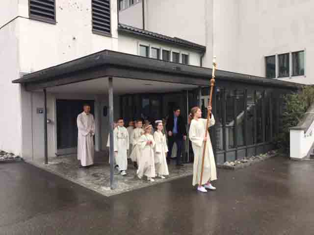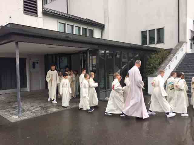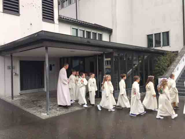 Einzug in die Kirche, dann Gottesdienst mit der feierlichen Erstkommunion in der Pfarrkirche, dann ein Volksapéro