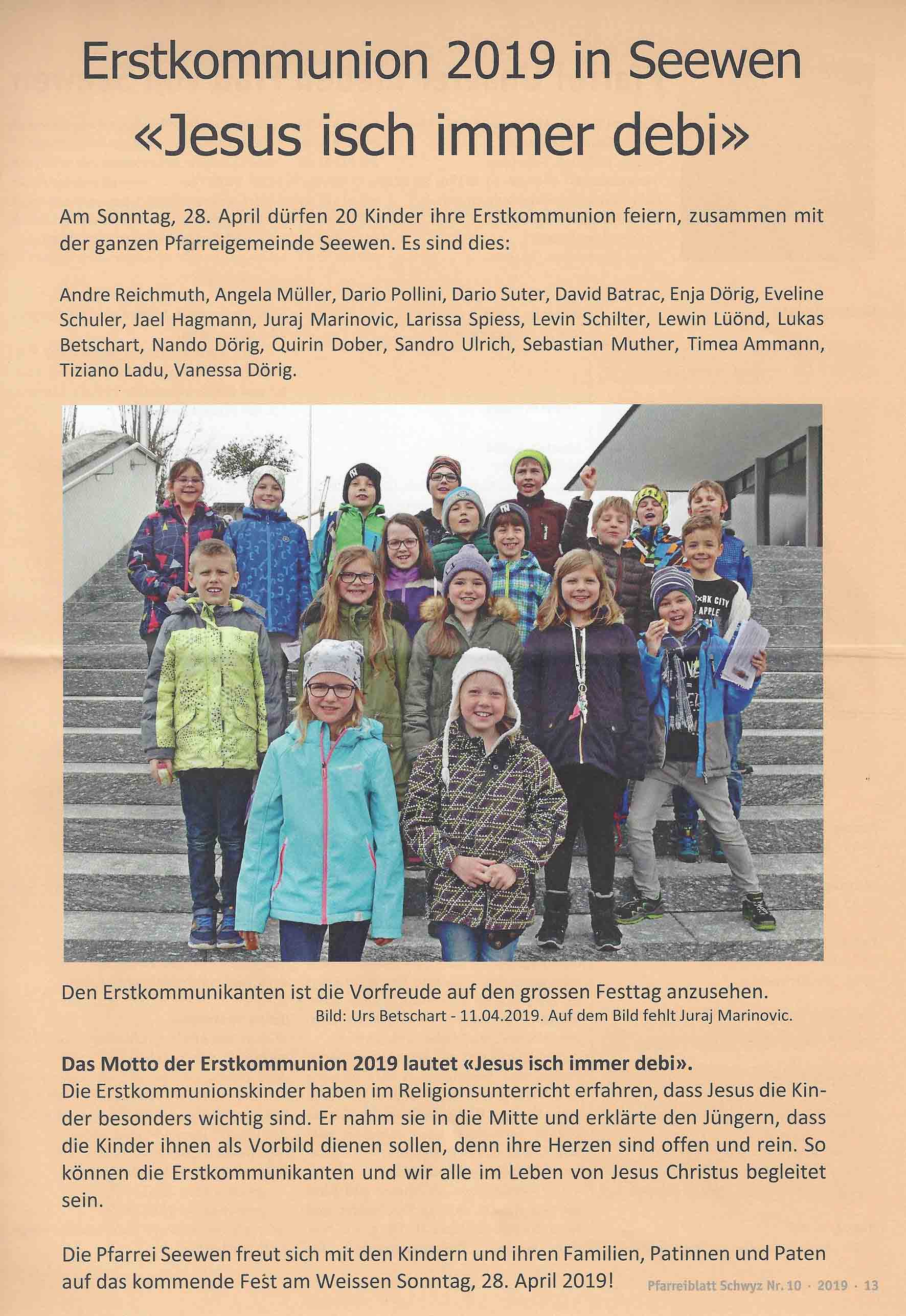 p. Wochenlang schon proben 20 Seebner Kinder katholischen Glaubens auf den kommenden Sonntag: den ‘Weissen Sonntag 2019’. Es ist jener Tag, an welchem die jungen Christen erstmals die heilige Kommunion empfangen werden. 7 Mädchen und 13 Buben haben unter Leitung des Katecheten Urs Betschart im Religionsunterricht (im Schulzimmer) und in der Pfarrkirche (dem Ort des Geschehens) den Ablauf des wichtigen Tages im Leben eines katholischen Gläubigen durchgeübt. Das Motto des Tages ist jenes der ganzen Pfarrei Schwyz: «Jesus isch immer debi.» Mitfiebern auf den Gottesdienst am Sonntagmorgen tun auch die Angehörigen. Sie werden Zeuge sein, wenn die jungen Christen zum Altar schreiten und dort das heilige Sakrament der Kommunion empfangen dürfen.