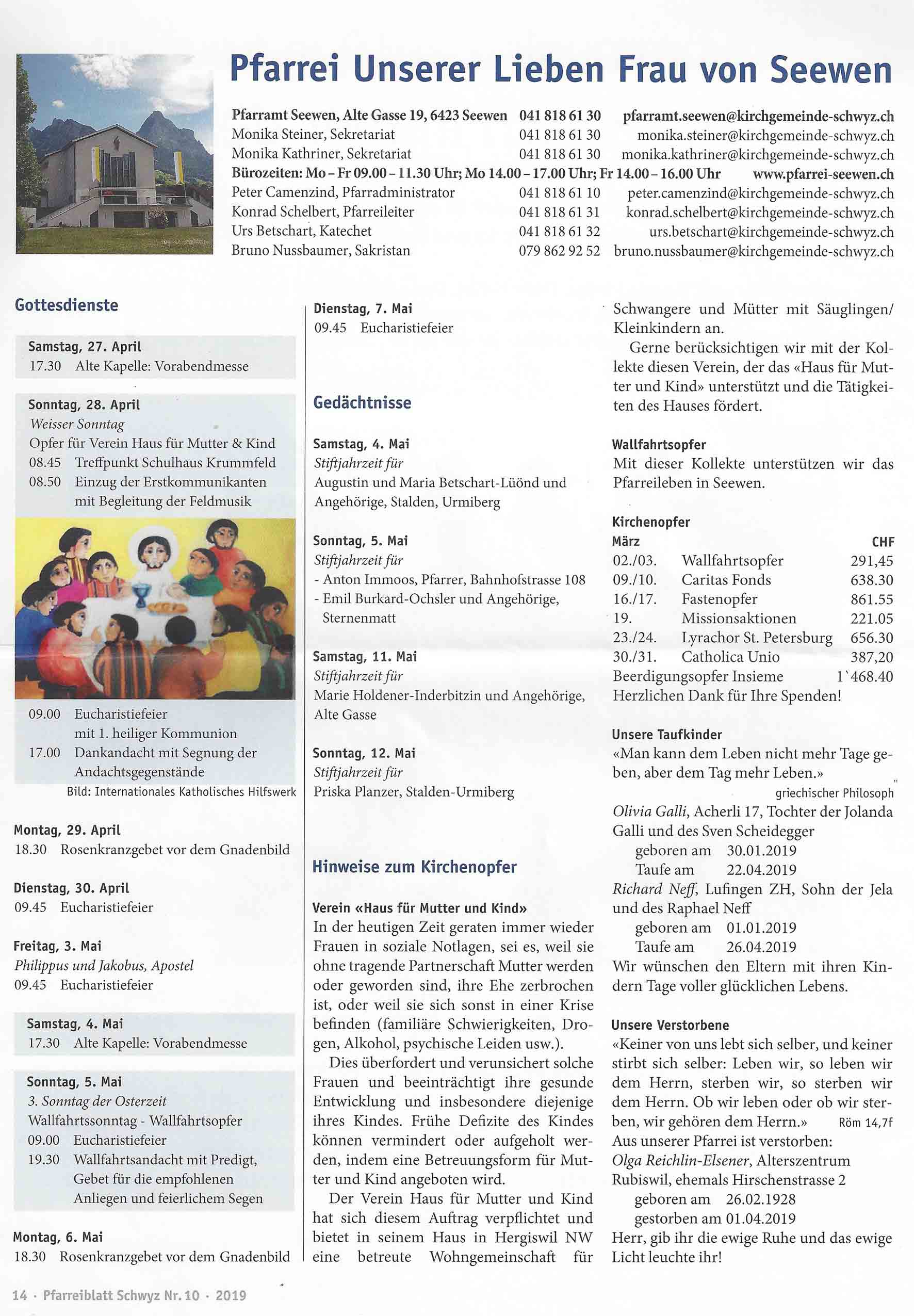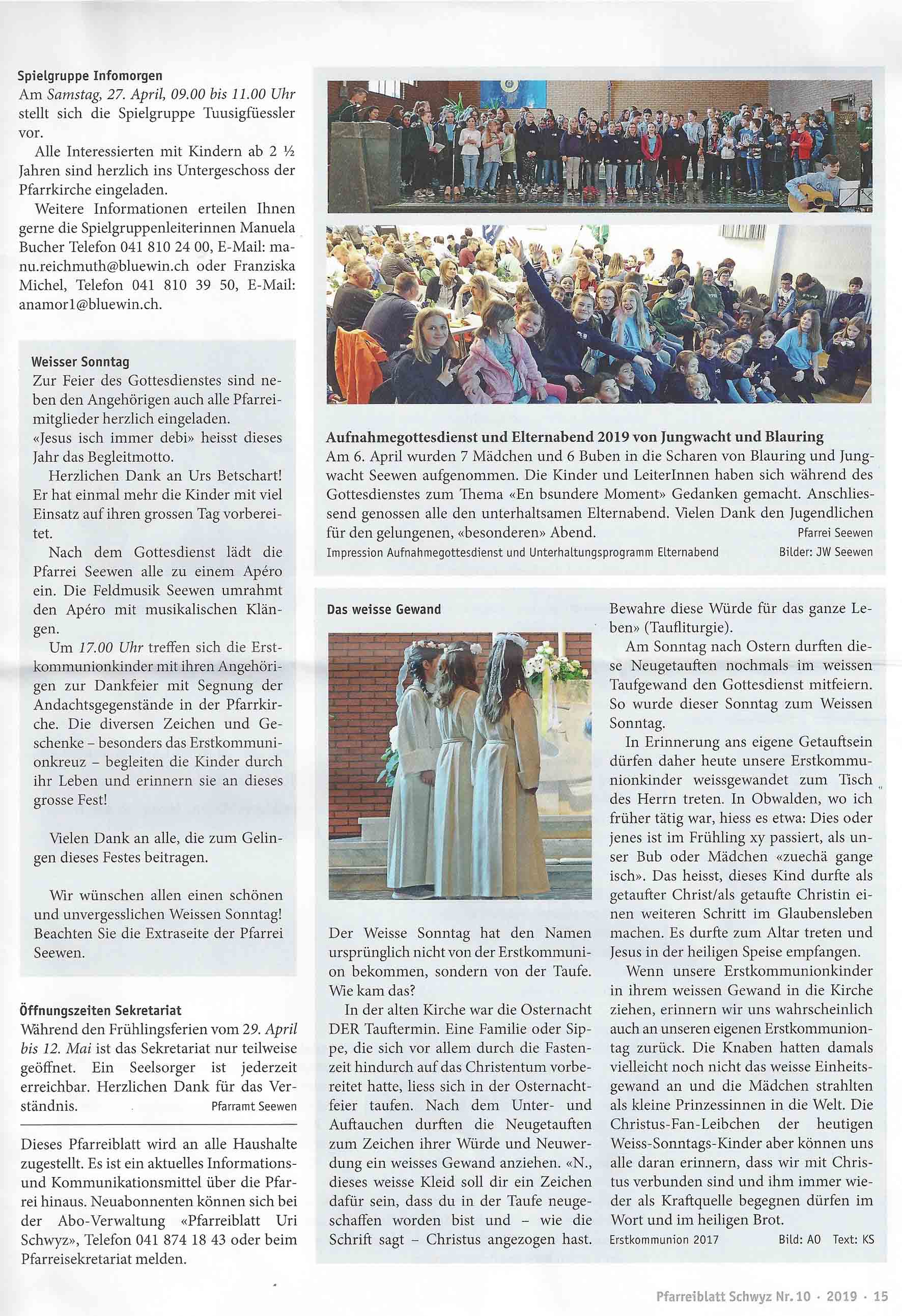 Im aktuellen Pfarrblatt Nr. 10 vom 27.4.-10.5.19 wurde wie folgt aus dem Pfarreileben und den Tag der ersten Kommunion berichtet:
