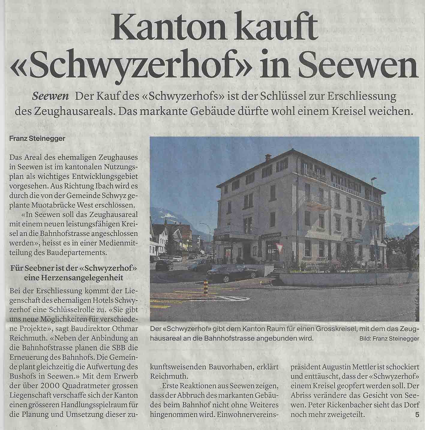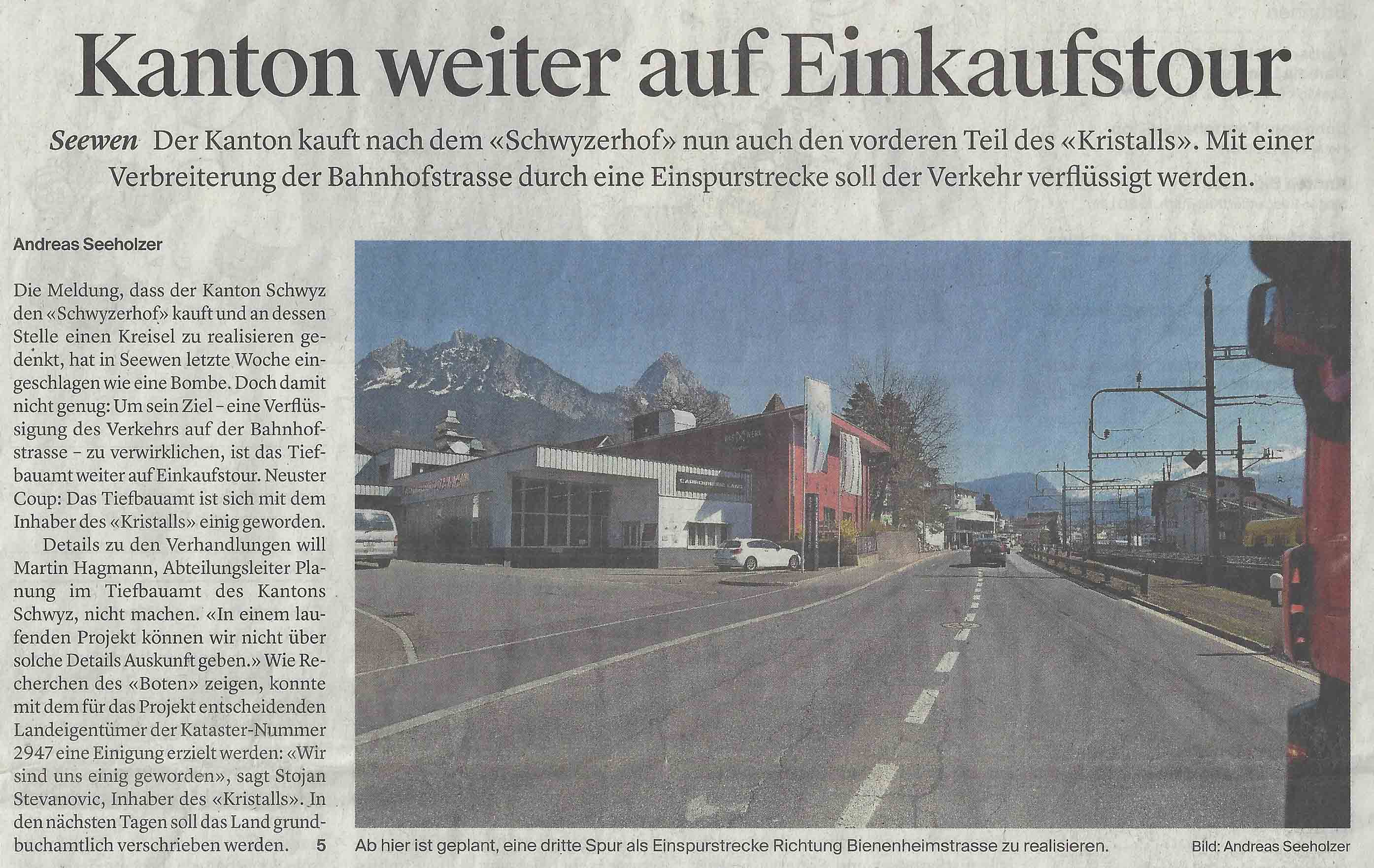 Am 30. März 2019 liess der 'Bote der Urschweiz' eine weitere 'Bombe platzen': er wusste der Leserschaft zu berichten, dass der Kanton Schwyz bzw. das zuständige Tiefbauamt vom 'Kristall'-Eigentümer rund 70 Quadratmeter Land erworben hat. Dies, um damit die Verbreiterung der Bahnhofstrasse zu ermöglichen. Somit werden Fakten geschaffen: eine weitere Verbreiterung der erkehrsachse mitten durch Seewen wird immer wahrscheinlicher. Statt eine Umfahrung um das Dorf zu planen und zu realisieren wird weiter auf eine Trennung des Dorfes hingewirkt. Ob das der richtige Weg ist?