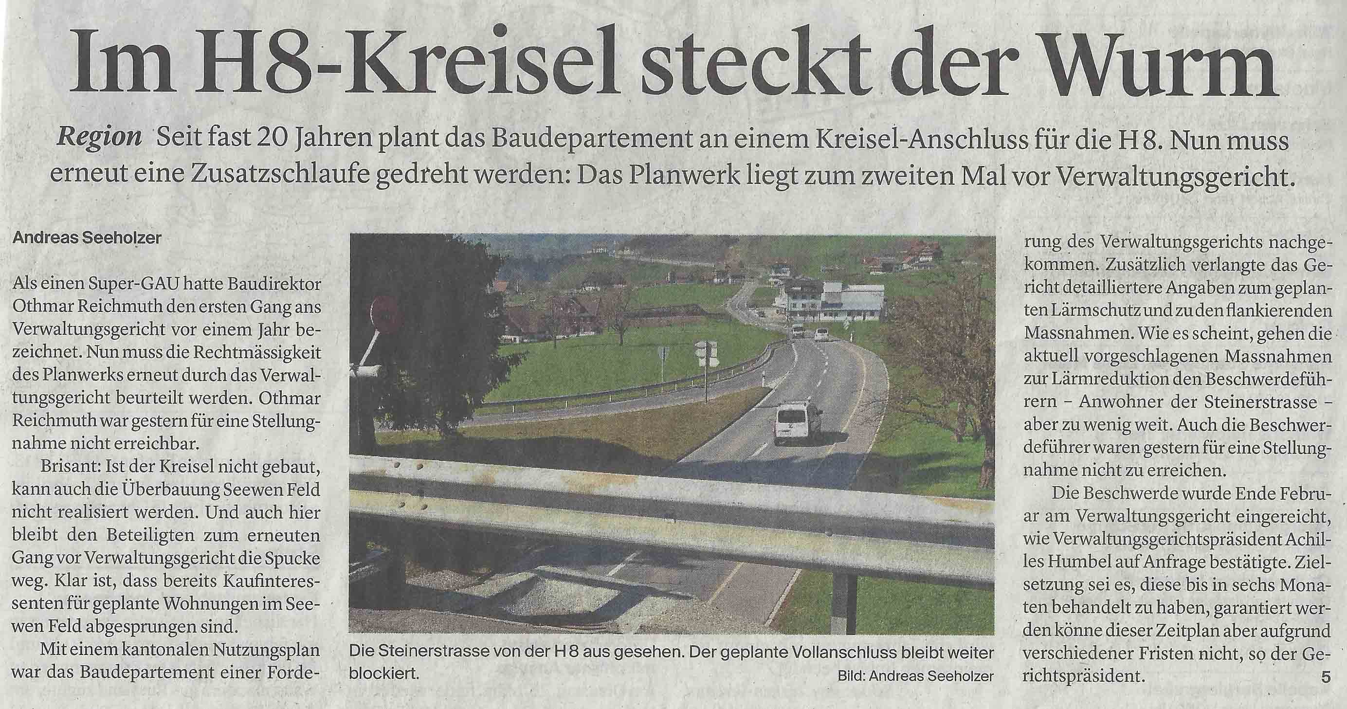 p. Es hat alles (wieder) so gut getönt: die Regierung bzw. die beauftragten kantonalen Büros haben ihr Grossprojekt eines Anschlusses der Steinerstrasse an die Umfahrungsstrasse H8 westlich von Seewen nachgebessert. Dies war nötig, weil das Verwaltungsgericht diverse ‘Zusatz-Hausaufgaben’ einforderte. Doch wieder ist ‘Sand ins Getriebe’ geraten. Einsprecher haben gegen die neu vorgeschlagenen Massnahmen (u.a. Verkehrsberuhigung, Lärmreduktion usw.) erneut Beschwerde erhoben. Heisst: das Gericht muss darüber entscheiden, ob die Beschwerdeführer zurecht wiederum gegen Teile des Kreisel-Projektes wettern…