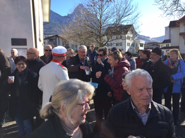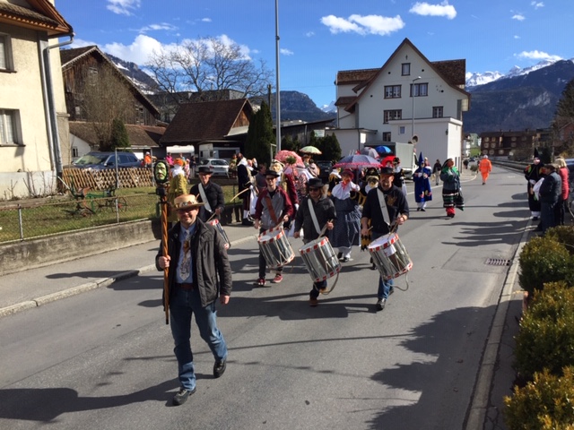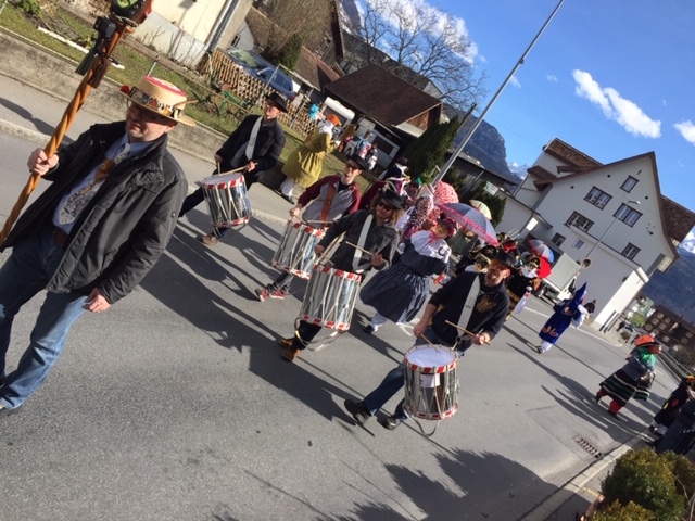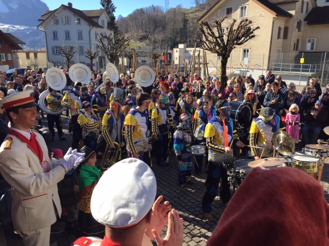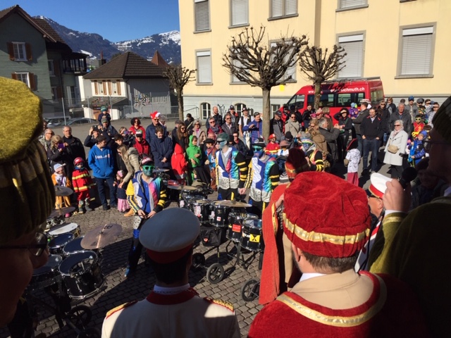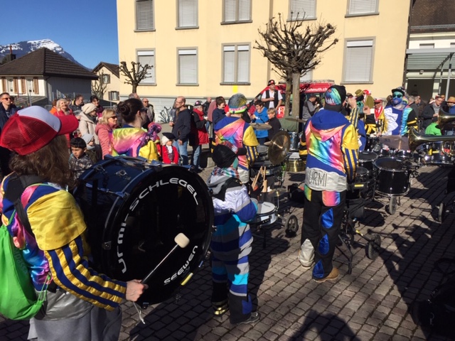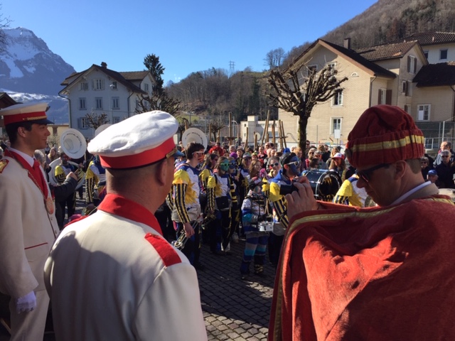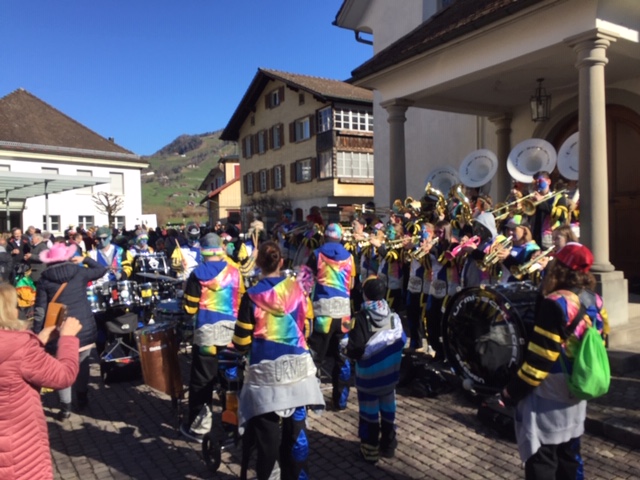 Rückblende: in Seewen wurde der letzte Fasnachtstag in drei Blöcken gefeiert: Block 1 als Umzug der Guggenmusig und der Kinderrott (mit 11 Jungtambouren!) durch das Dorf am Fusse des Piz Urmibergs, dann Block 2 der Staatsapéro vor der Alten Kapelle und schliesslich als Block 3 die grosse Rott und das Negus-Gremium, welche die Strassen- und Beizenfasnacht nachmittags prägten. Das Schöne daran: das Wetter lieferte die perfekte Kulisse für den farbenfrohen Tag.