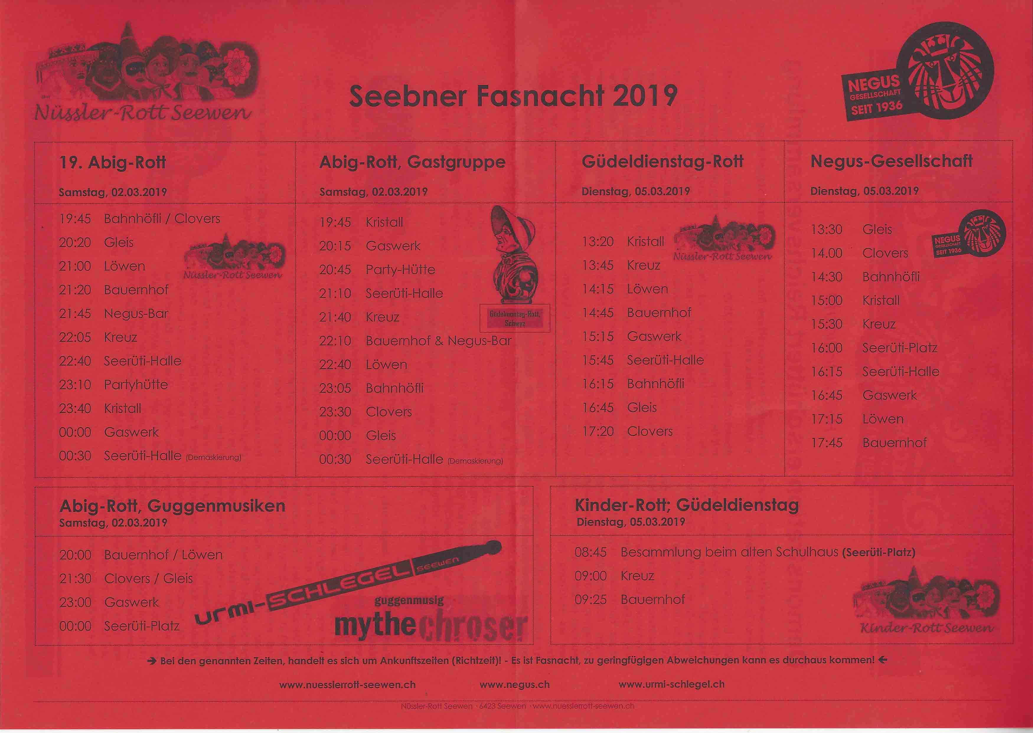 p. Nur noch wenige Tage dauert sie, die Fasnacht, auch 5. Jahreszeit genannt. Hüben wie drüben finden Veranstaltungen fast im Stundentakt statt. Dazu gehören auch Auftritte des Kaisers Negus Negesti XXXXI. Daniele der Kaltgepresste mit seinem Gefolge. Doch unaufhaltsam nähern sich Wolken am Horizont, die das Ende der fröhlichen Narren-Tage setzen werden. Bis dato aber wird noch tüchtig gefeiert. So am kommenden Samstag (2. März 2019), zu welchem die Seebner Nüssler-Rott das Volk zwischen Urmiberg, Lauerzersee und Haggenegg einlädt, um an der ‚Abendrott‘ teilzunehmen. Wie gewohnt zieht diese dann von Schankhaus zu Schankhaus, um das Volk zu bezirzen. Ebenfalls unterwegs werden dannzumal eine Gastgruppe aus Schwyz sein, namentlich die ‘Güdelmontag-Rott’. Aber auch diverse ‚wilden Gruppen‘ sollen unterwegs sein, wie man munkeln hört. Sie alle wollen nur eins: fröhliche Stimmung verbreiten! Den Schlusspunkt bildet wie üblich der Staatsfeiertag am Güdeldienstag, an welchem nochmals tüchtig gefestet wird…