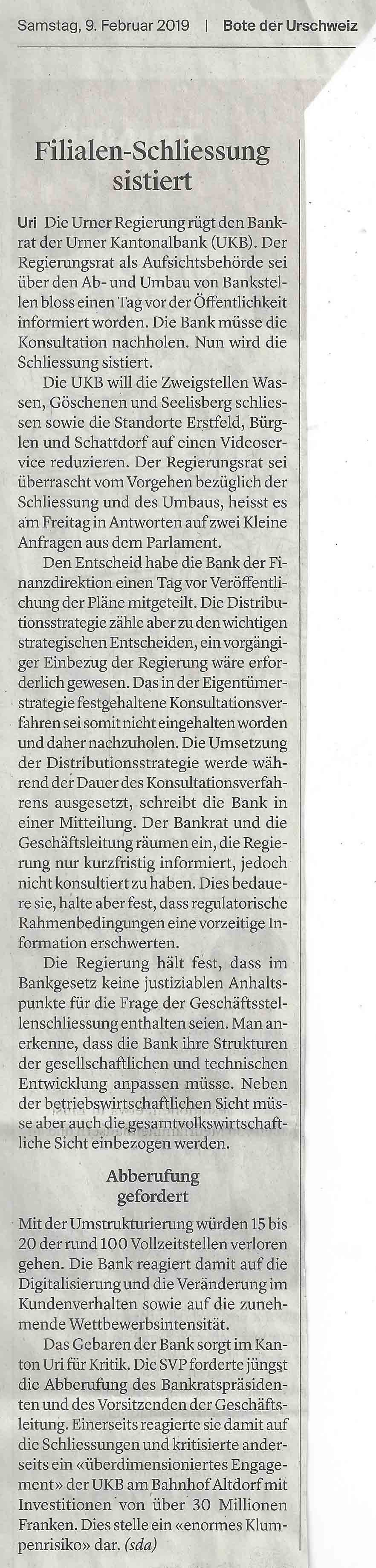 Ganz anders sieht das im Nachbarkanton Uri aus. Dort hat die Geschäftsleitung der Staatsbank ebenfalls entschieden, zahlreiche Filialen zu schliessen. Sie ging forsch voran und informierte die politische Elite nur einen Tag vor der Oeffentlichkeit. Das hat nun einen heftigen Sturm ausgelöst. Unter Federführung der SVP muss die Bankleitung nun heftigen Widerstand einstecken. Denn die Urner Parteistrategen fürchten um die Ausblutung ihrer Orte…