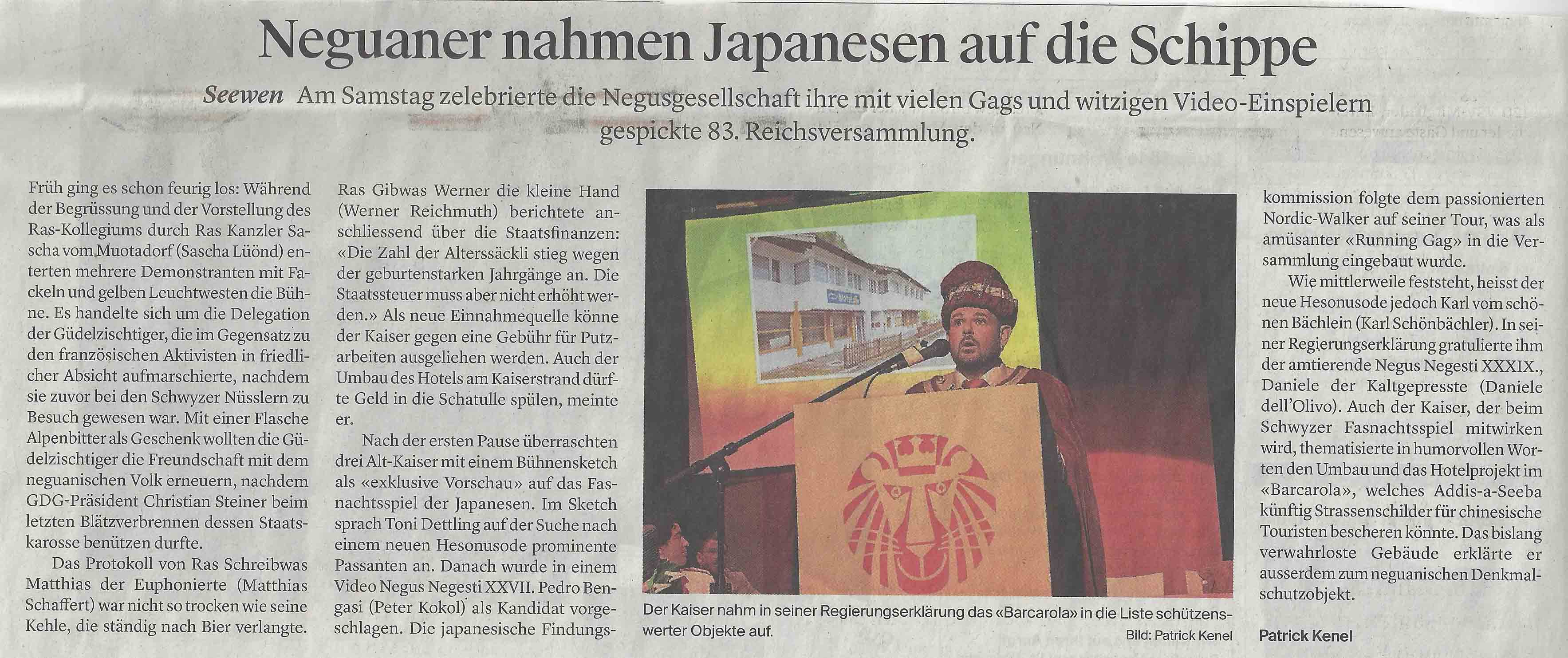 p. Mit der Reichsversammlung am 12. Jänner 2019 in der Mehrzweckhalle ‘Seerüti’ ist in Seewen die fünfte Jahreszeit – die Fasnacht – offiziell angebrochen bzw. eröffnet worden. Im Mittelpunkt der Versammlung der Negusgesellschaft standen Ereignisse im Dorf, die in den letzten 365 Tagen für Diskussionen sorgten. Mehr als nur einmal kam das in Totalrenovation befindliche Haus ‘Barcarola’ aufs Tablett. Dieses soll ja schon bald Herberge für asiatische Touristen werden. Auch Themen aus der Nachbarschaft wurden auf die Schippe genommen, insbesondere die Japanesengesellschaft aus Yeddo-Schwyz (Hauptort Schwyz). Farbtupfer lieferten die vielen Vereinsdelegationen, die die Grüsse aus ihren Landen ins Kaiserreich am Piz Urmiberg brachten.