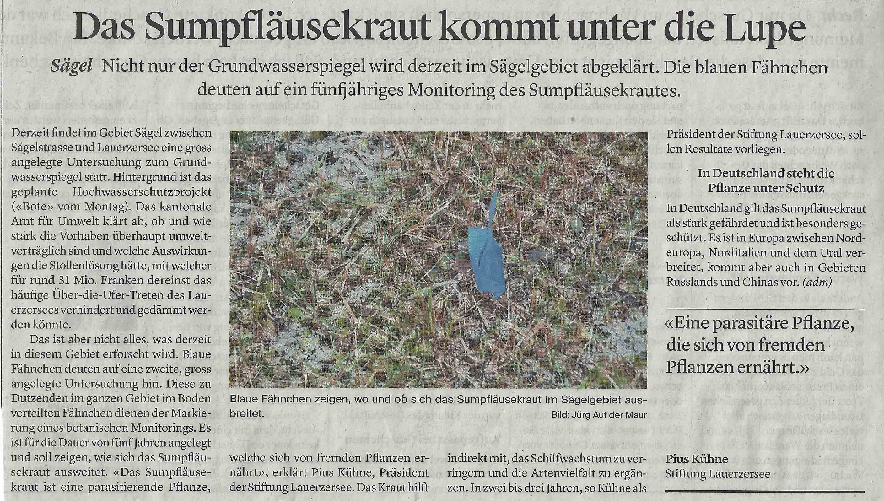 p. Blaue Fähnchen im ganzen Sägel-Streugebiet deuten darauf hin, dass da etwas passiert. In der Tat: es sind Hilfsmittel, die die Fachleute verwenden, um Fakten für einen Umweltverträglichkeitsbericht zusammenzutragen. Dieser Bericht entsteht im Auftrag des Kantons, der ihn für die Beantwortung der Frage «Hochwasserschutz Lauerzersee» beiziehen wird. Entscheidend nämlich im Bericht wird sein, wie gross Einflüsse auf das Moorgebiet sein könnten, wenn der Lauerzersee-Ausfluss künftig reguliert würde. Eine Regulierung nämlich wäre eine der Möglichkeiten, um künftig Hochwasser rund um den Lauerzersee und im besiedelten Teil von Seewen zu vermeiden…