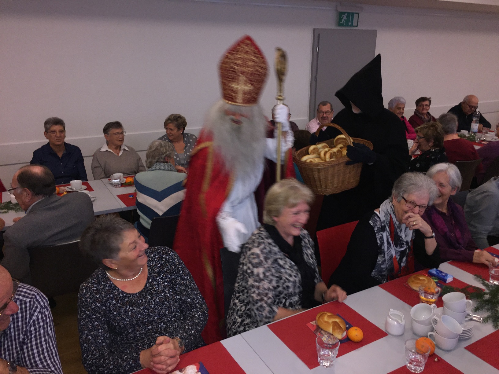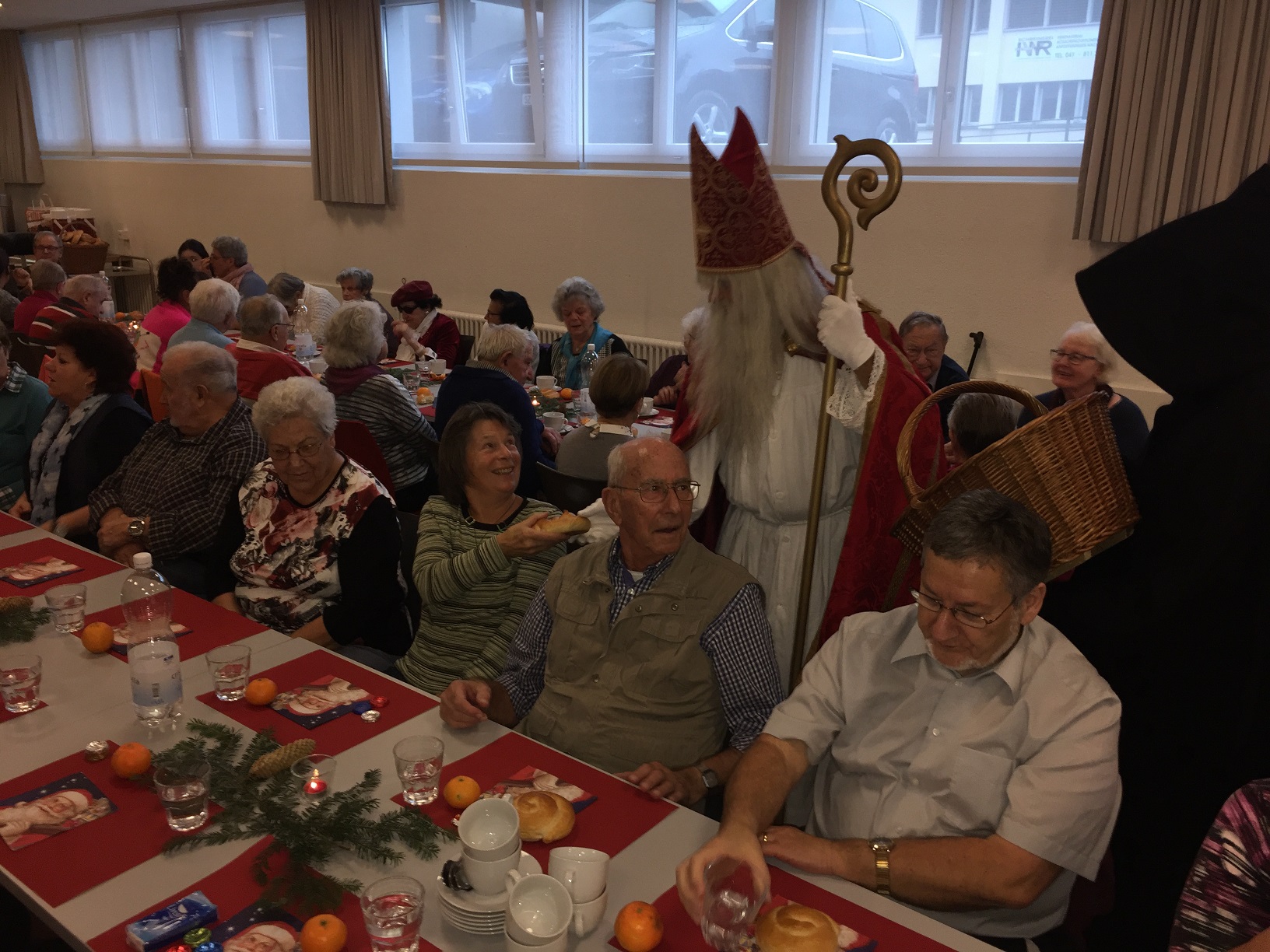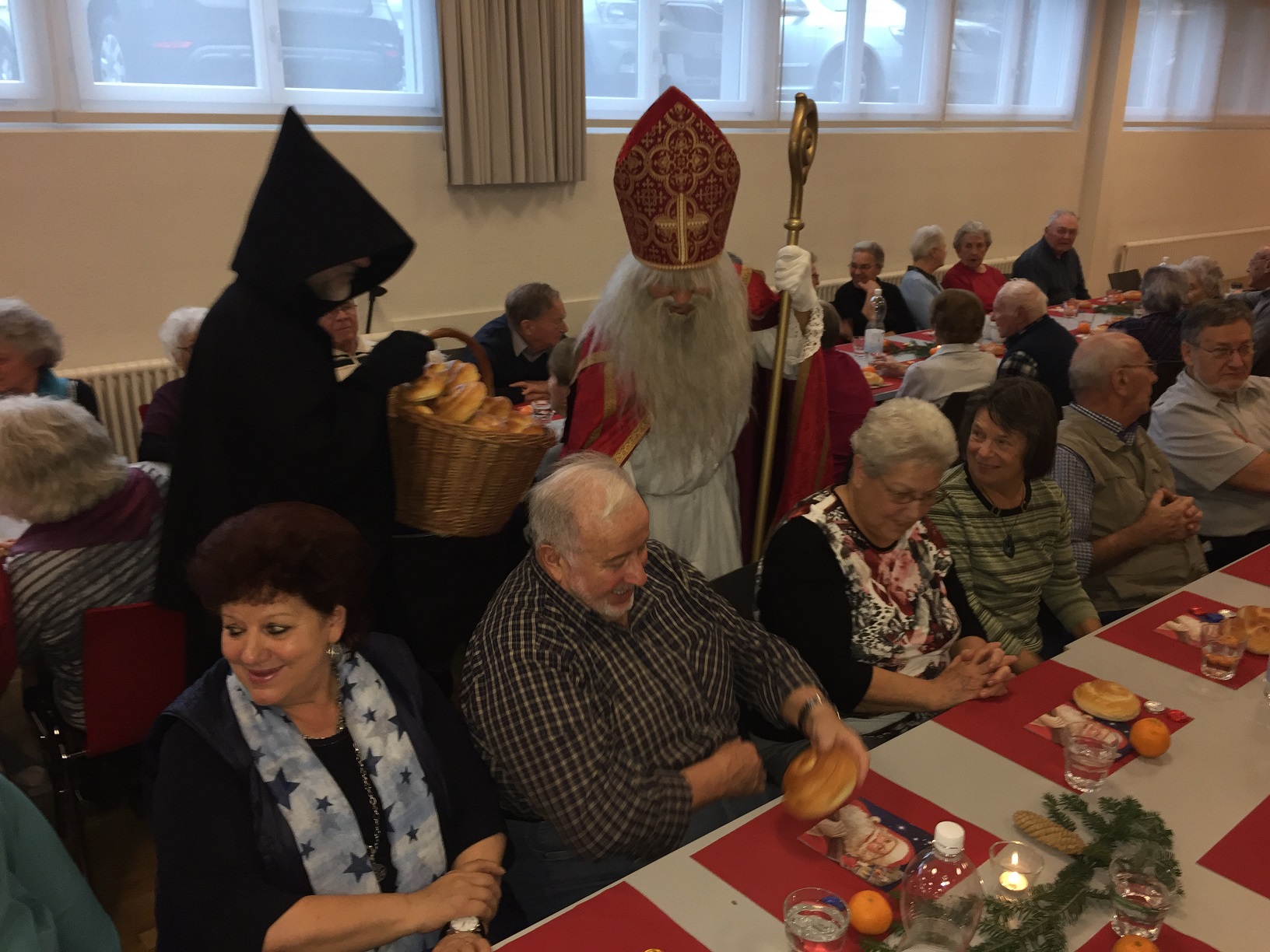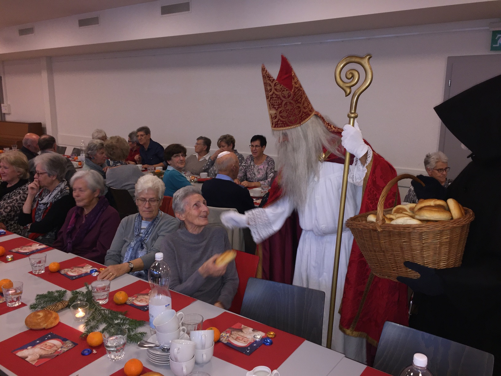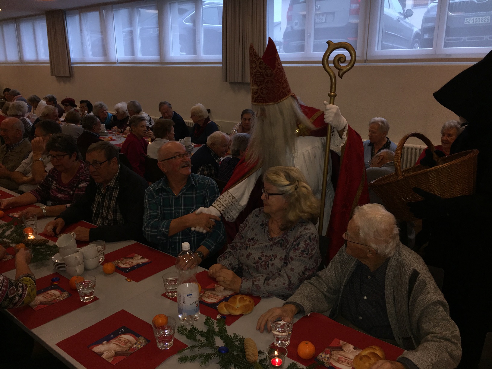p. Er meint es immer wieder gut mit der Seebner Bevölkerung, der Samichlaus. Dies jedenfalls bestätigen gleich zwei Veranstaltungen an welchen der Gesandte des Bischofs von Myra, St. Nikolaus, zugegen war. Am Sonntag (2.12.2018) besuchte er die Kinder (Chlaus-Auszug aus der Pfarrkirche), tags darauf am Montag die Senioren. Gezeichnet von den Strapazen nach dem Besuch aller Seebner Buebe und Meitli schaffte es dr Chlaus mit einem Gehilfen gerade noch in den Pfarreisaal. Dass die zwei Gestalten bei misslichem Wetter in den Pfarreisaal pilgerten, dafür war die Frauengemeinschaft Seewen verantwortlich. Sie bereiteten den zwei Herren den Weg vor. Nahezu 80 Senioren beiderlei Geschlechts folgen dem Aufruf zur Audienz mit dem Gesandten – und sie wurden für das Warten nicht enttäuscht. Ein butes Rahmenprogramm mit einem Kinderchor liess die Zeit schnell verfliegen. Der Höhepunkt war zweifelsohne jener Moment, als der Bischofsvertreter sich die Zeit nahm, allen Anwesenden persönlich die Hand zu schütteln und ihnen einen Grittibänz in die Hände zu drücken. Die fleissigen Damen der Frauengemeinschaft standen dem hohen Besuch in nichts nach und bedienten die Anwesenden ebenfalls mit hausgemachtem Lebkuchen. Das gemütliche Beisammensein dauerte bis in den späten Nachmittag hinein an, die Erinnerungen daran viel länger.