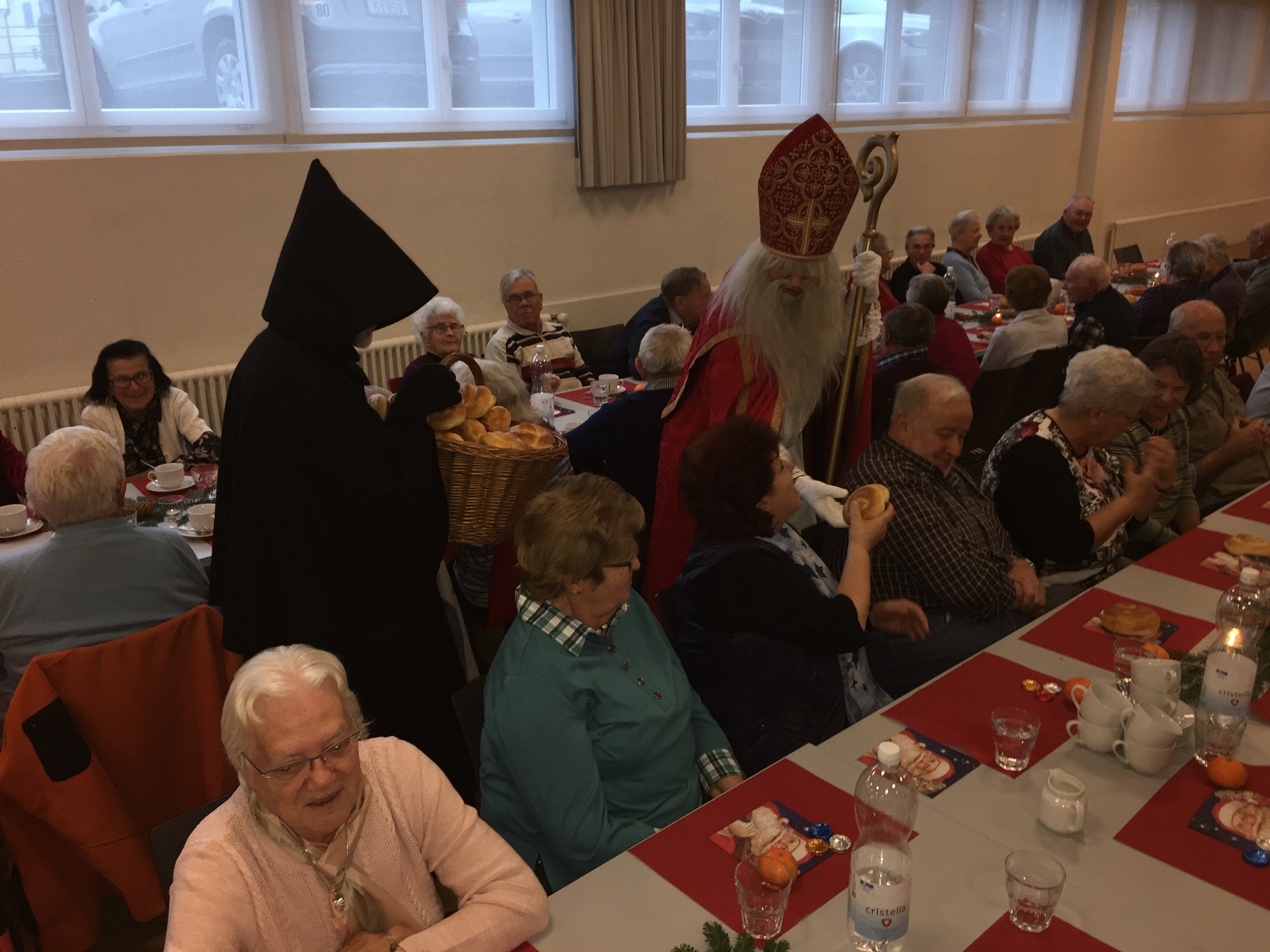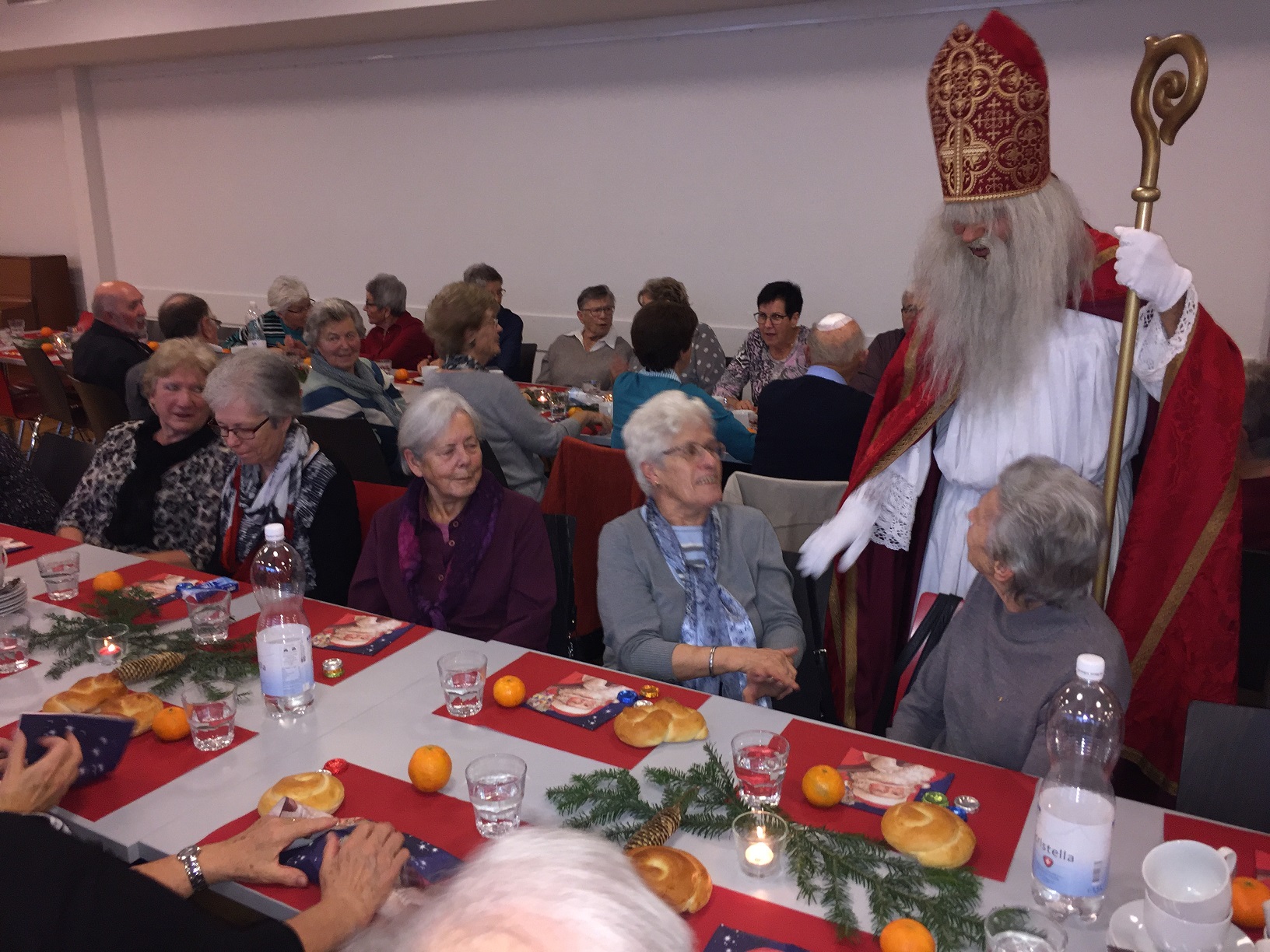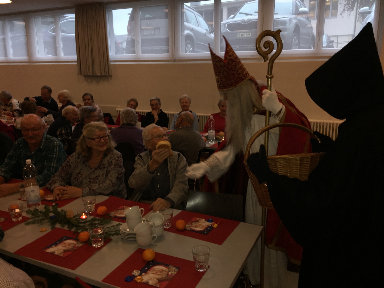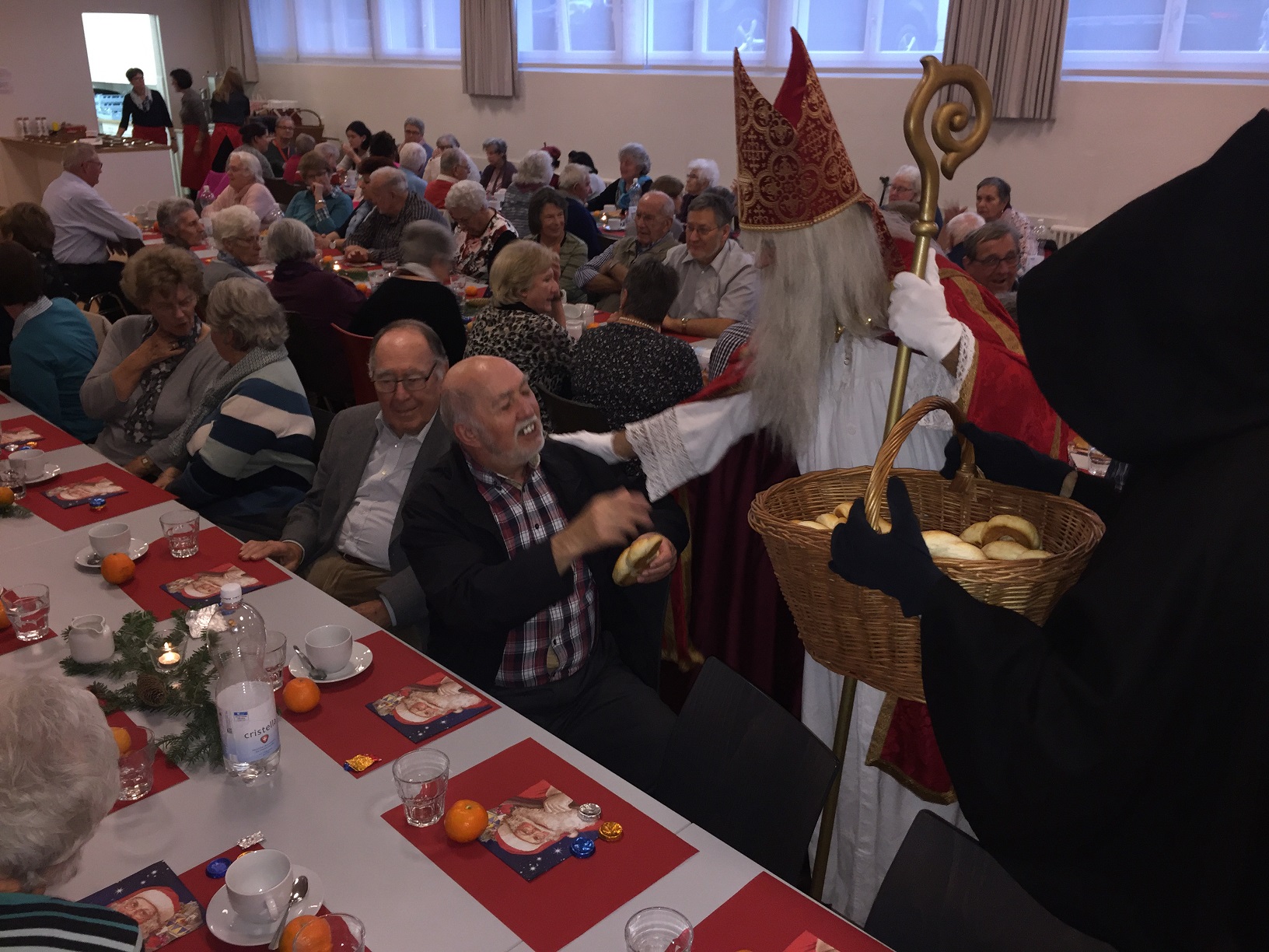 p. Er meint es immer wieder gut mit der Seebner Bevölkerung, der Samichlaus. Dies jedenfalls bestätigen gleich zwei Veranstaltungen an welchen der Gesandte des Bischofs von Myra, St. Nikolaus, zugegen war. Am Sonntag (2.12.2018) besuchte er die Kinder (Chlaus-Auszug aus der Pfarrkirche), tags darauf am Montag die Senioren. Gezeichnet von den Strapazen nach dem Besuch aller Seebner Buebe und Meitli schaffte es dr Chlaus mit einem Gehilfen gerade noch in den Pfarreisaal. Dass die zwei Gestalten bei misslichem Wetter in den Pfarreisaal pilgerten, dafür war die Frauengemeinschaft Seewen verantwortlich. Sie bereiteten den zwei Herren den Weg vor. Nahezu 80 Senioren beiderlei Geschlechts folgen dem Aufruf zur Audienz mit dem Gesandten – und sie wurden für das Warten nicht enttäuscht. Ein butes Rahmenprogramm mit einem Kinderchor liess die Zeit schnell verfliegen. Der Höhepunkt war zweifelsohne jener Moment, als der Bischofsvertreter sich die Zeit nahm, allen Anwesenden persönlich die Hand zu schütteln und ihnen einen Grittibänz in die Hände zu drücken. Die fleissigen Damen der Frauengemeinschaft standen dem hohen Besuch in nichts nach und bedienten die Anwesenden ebenfalls mit hausgemachtem Lebkuchen. Das gemütliche Beisammensein dauerte bis in den späten Nachmittag hinein an, die Erinnerungen daran viel länger.