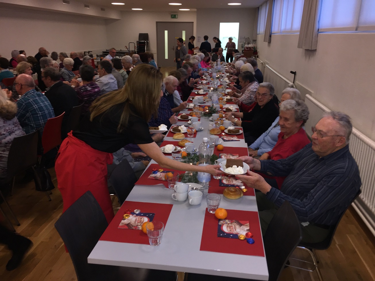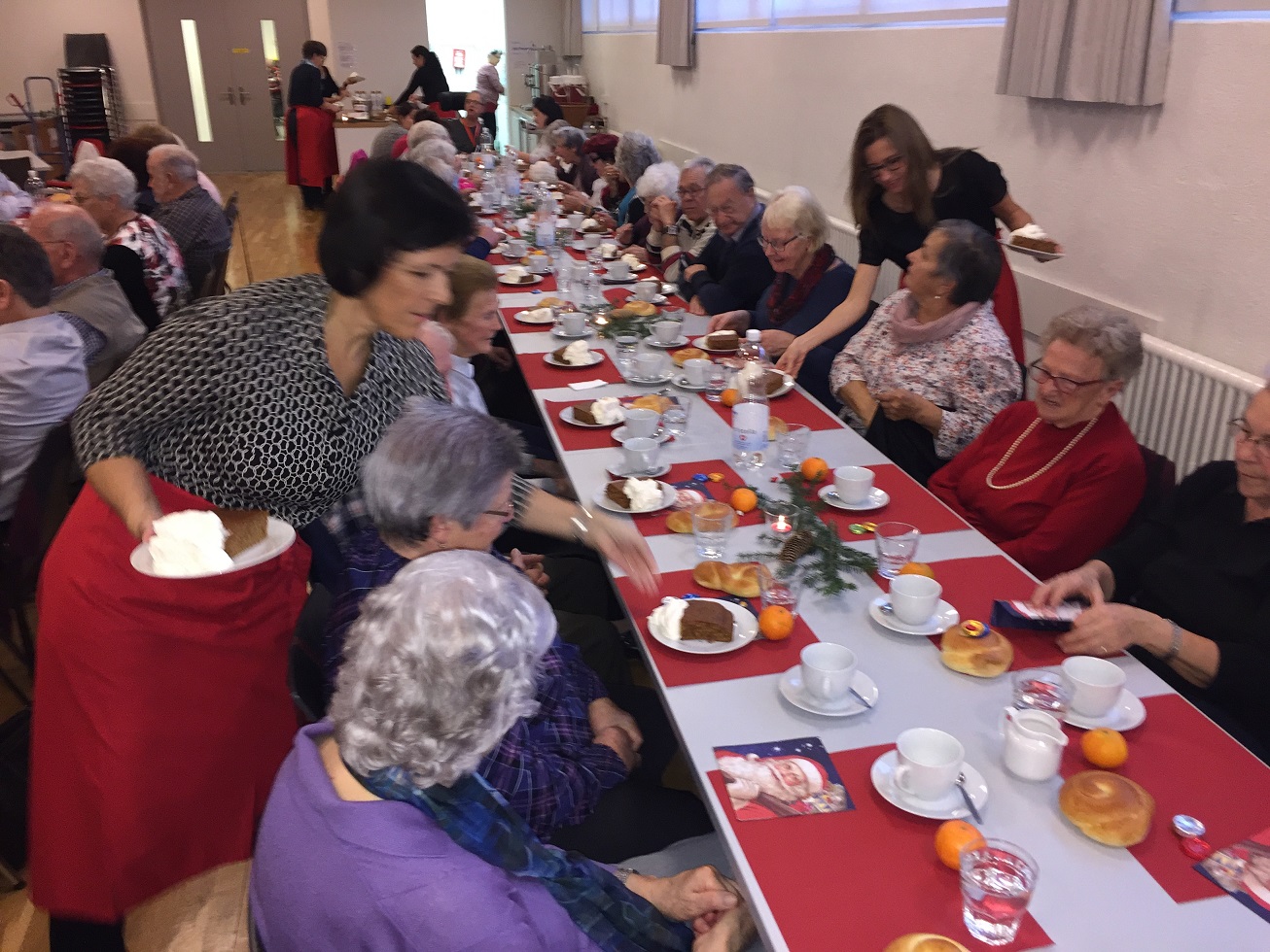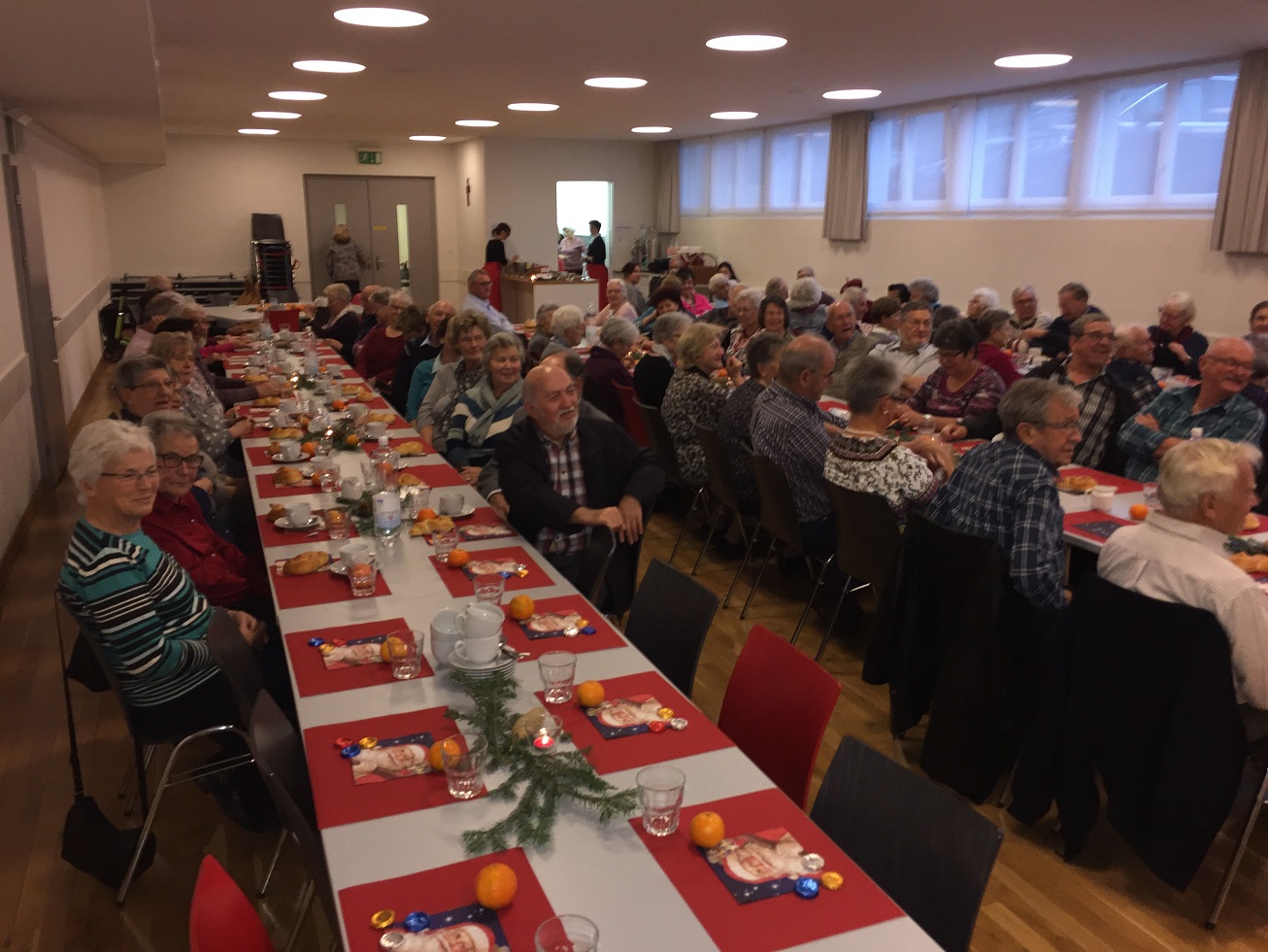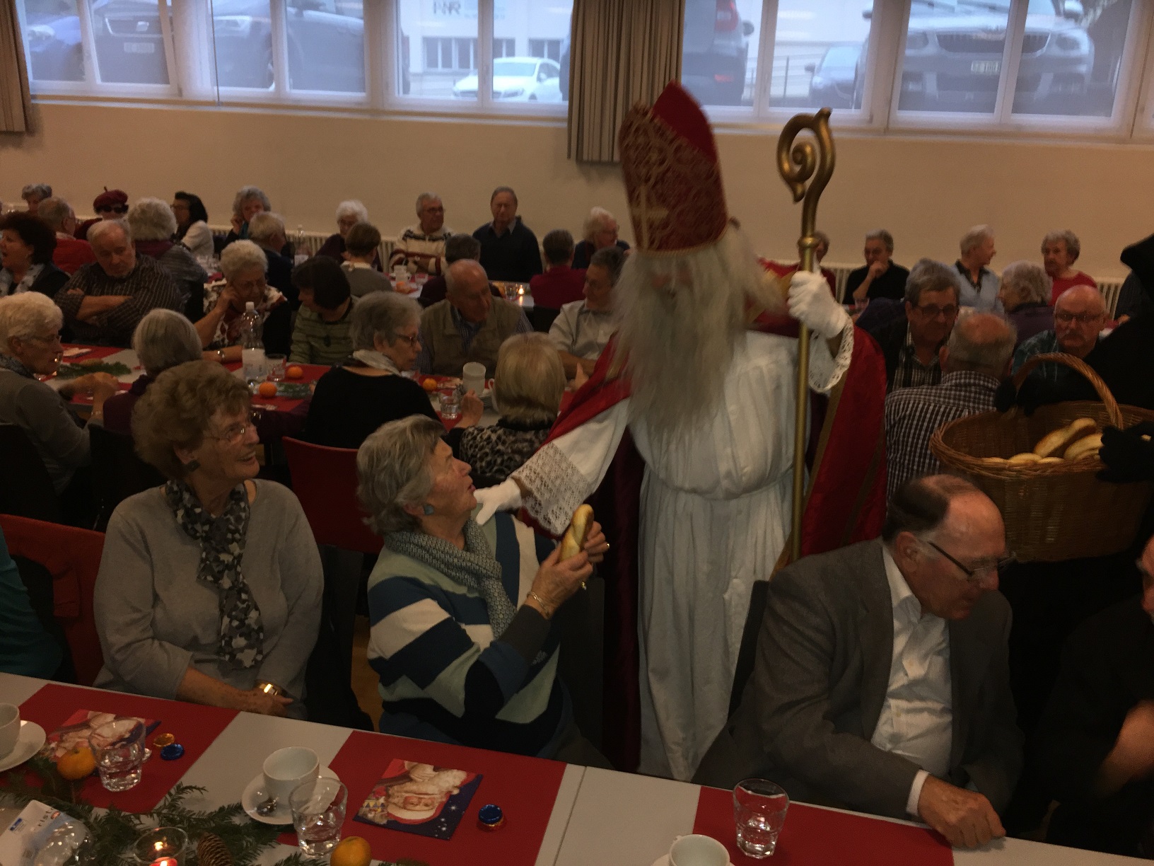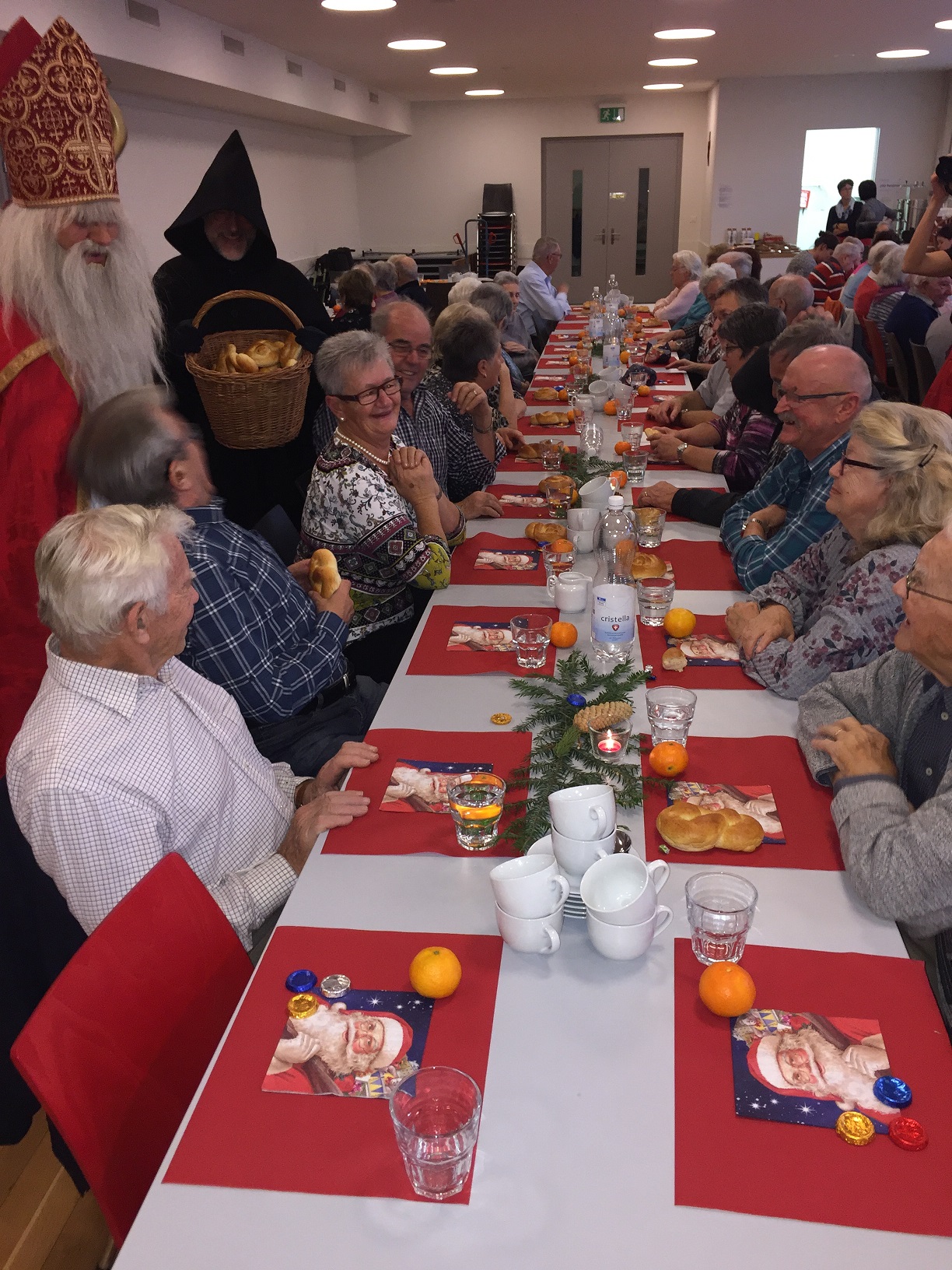 p. Er meint es immer wieder gut mit der Seebner Bevölkerung, der Samichlaus. Dies jedenfalls bestätigen gleich zwei Veranstaltungen an welchen der Gesandte des Bischofs von Myra, St. Nikolaus, zugegen war. Am Sonntag (2.12.2018) besuchte er die Kinder (Chlaus-Auszug aus der Pfarrkirche), tags darauf am Montag die Senioren. Gezeichnet von den Strapazen nach dem Besuch aller Seebner Buebe und Meitli schaffte es dr Chlaus mit einem Gehilfen gerade noch in den Pfarreisaal. Dass die zwei Gestalten bei misslichem Wetter in den Pfarreisaal pilgerten, dafür war die Frauengemeinschaft Seewen verantwortlich. Sie bereiteten den zwei Herren den Weg vor. Nahezu 80 Senioren beiderlei Geschlechts folgen dem Aufruf zur Audienz mit dem Gesandten – und sie wurden für das Warten nicht enttäuscht. Ein butes Rahmenprogramm mit einem Kinderchor liess die Zeit schnell verfliegen. Der Höhepunkt war zweifelsohne jener Moment, als der Bischofsvertreter sich die Zeit nahm, allen Anwesenden persönlich die Hand zu schütteln und ihnen einen Grittibänz in die Hände zu drücken. Die fleissigen Damen der Frauengemeinschaft standen dem hohen Besuch in nichts nach und bedienten die Anwesenden ebenfalls mit hausgemachtem Lebkuchen. Das gemütliche Beisammensein dauerte bis in den späten Nachmittag hinein an, die Erinnerungen daran viel länger.