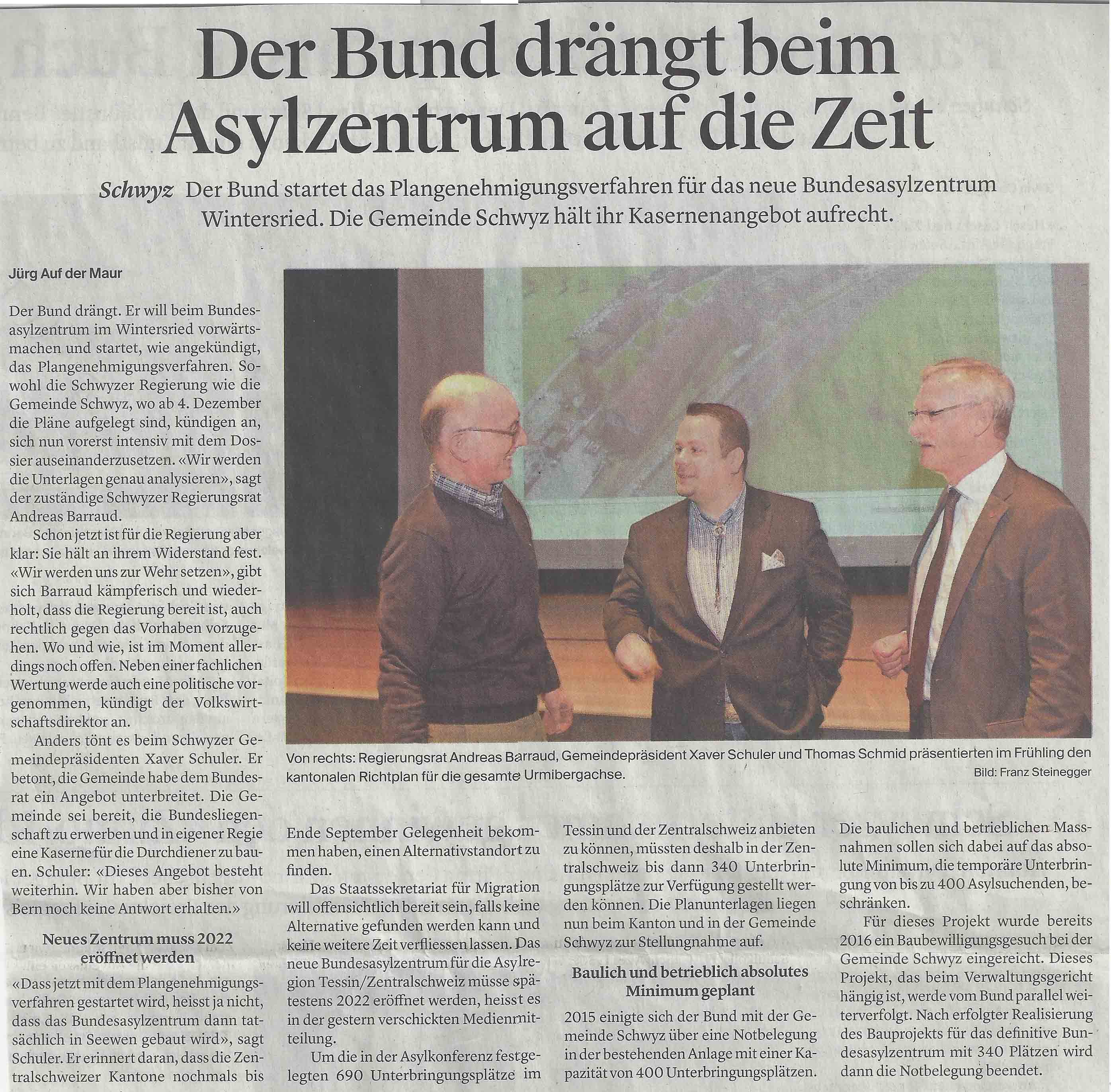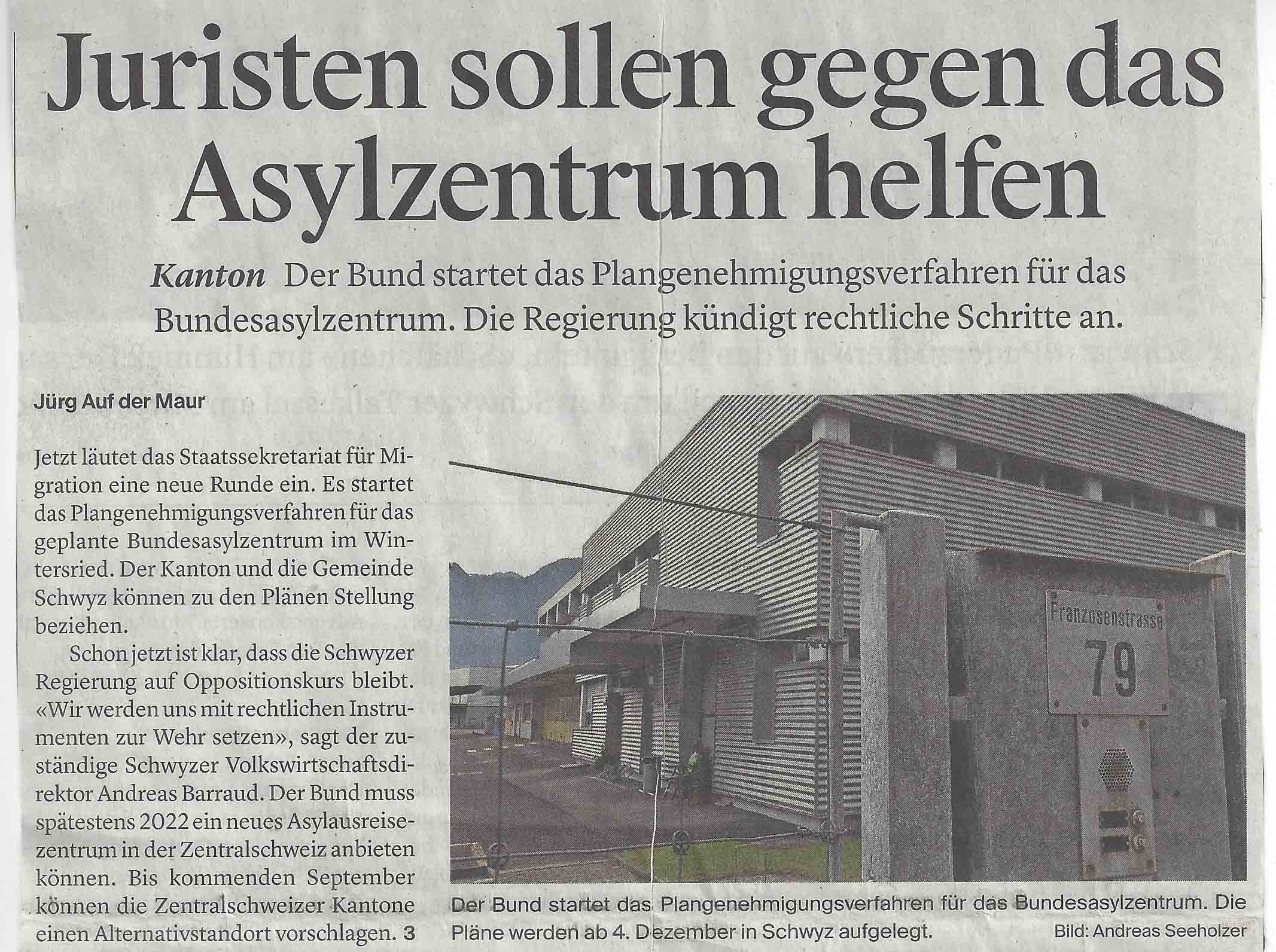 p. Die Realisierung des Schwyzer Ausschaffungszentrums für abgewiesene Asylbewerber kommt voran. Denn, der Bund hat hierzu das Plangenehmigungsverfahren für das Zentrum im Ibächler Wintersried eröffnet. Das hat die Schwyzer – vor allem die Regierung, die sich gegen ein solches Vorhaben stemmt - auf den Plan gerufen und für Reaktionen gesorgt. Der Gemeinderat Schwyz hingegen beharrt an seinem ursprünglichen Ja zum Zentrum, will dafür im Gegenzug das Areal käuflich erwerben und darauf eine Kaserne für militärische Durchdiener bauen…