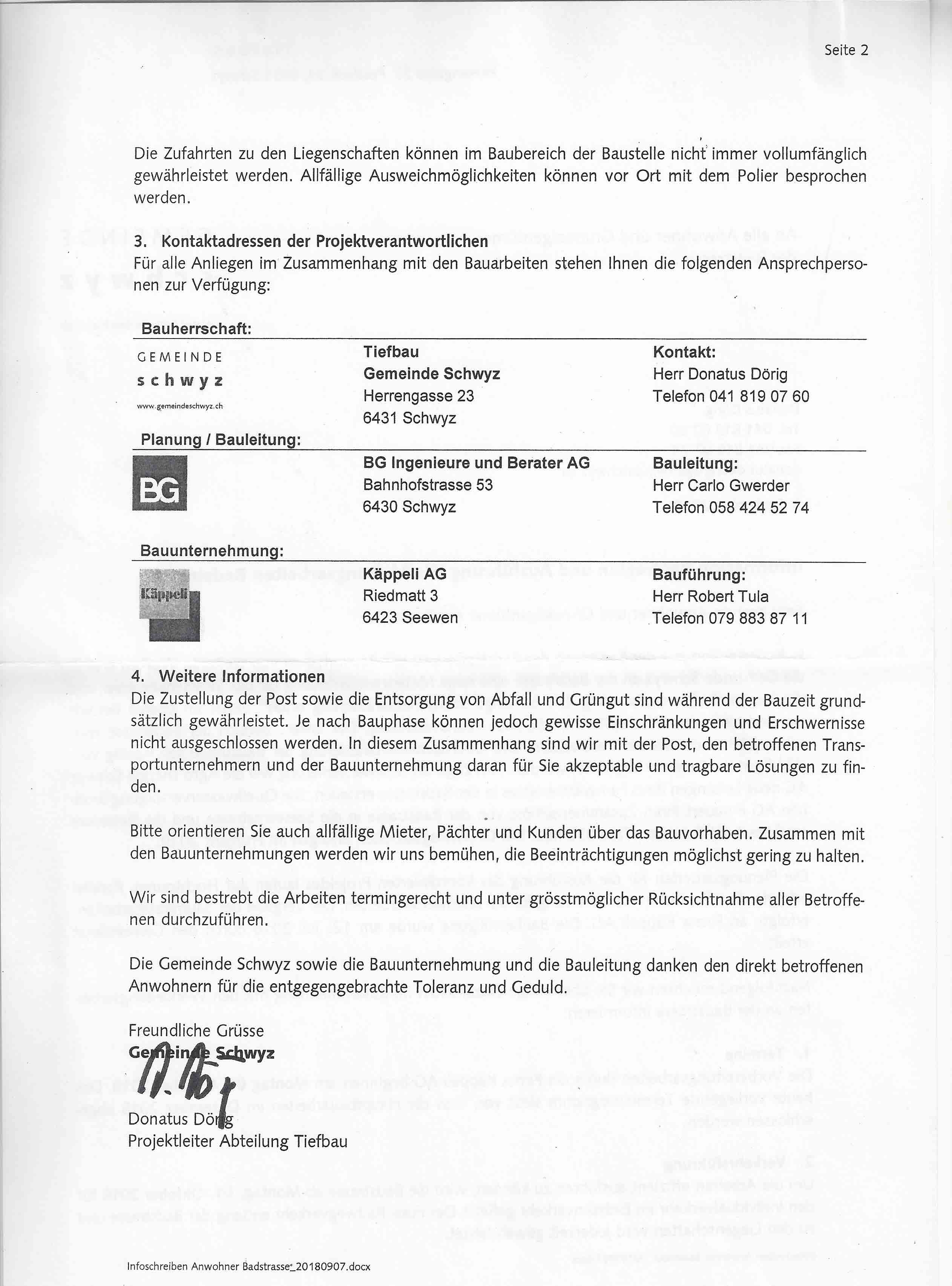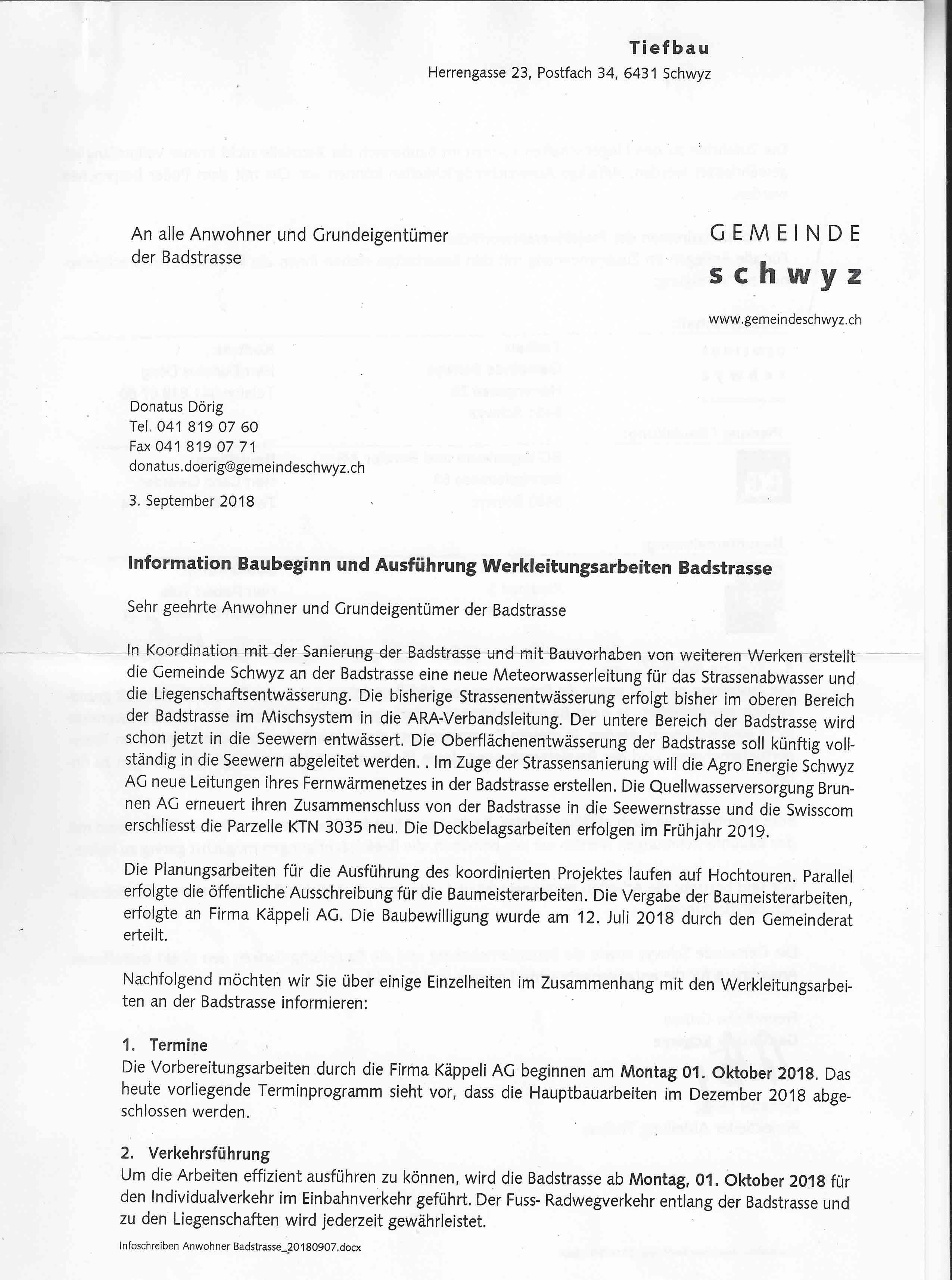 p. In den 1980er-Jahren wurde sie letztmals umfassend saniert, die Badstrasse zwischen der SBB-Unterführung beim Hotel Rössli und der Einbiegung in die Seewernstrasse. Damals wurden links und rechts der Fahrbahn rote Radstreifen eingebracht sowie die beiden Uebergänge mit Pflastersteinen versehen. Jetzt ist an gleicher Stelle wieder eine Grossbaustelle eröffnet worden. Grund: neue Werkleitungen. In einem Schreiben informierte das Tiefbauamt der Gemeinde anfangs September die Anwohner über die geplanten Arbeiten. Zur Hauptsache geht es diesmal um das Meteorwasser, das in neuen Leitungen abgeführt werden soll. Gleichzeitig wird der offene Graben dazu genutzt, um Werkleitungen neu zu verlegen. Dafür interessierten sich die Agro Energie Schwyz AG, die Quellwasserversorgung Brunnen AG sowie die Swisscom.
