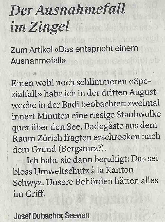 p. Wer sich regelmässig im, auf und am Lauerzersee aufhält, dem entgeht nicht, was sich an der Urmibergflanke ab und zu für eine unschöne Sache abspielt. Da wird der Berg weggesprengt, was das Zeug hergibt. Hauptsache, es wird damit – von auswärts Wohnenden - mächtig Kies gemacht. Was die Anstösser und Naherholungsraumsuchenden dafür erhalten, ist nicht erwähnenswert. Denn Staub ist ja nichts Schlimmes. Ausser, man atmet ihn regelmässig in grossen Mengen ein (Staub-Lungen)… Dass dies nicht geschieht, dafür schaut die Behörde, unsere Verwaltung, unsere gewählten Politiker. Sie alle sind mitverantwortlich dafür, dass überwacht und hingeschaut wird, was sich im Steinbruch Zingel so alles tut. Die vielen Involvierten schauen, dass die Luftverschmutzung sich im Rahmen hält, dass die Strasse nicht übermässig wegen Sprengungen gesperrt werden muss und dass die Renaturierung wie verlangt zügig vorwärts geht. Kurzum, allesamt schauen zu uns, damit es uns gut geht – in UNSEREM Lebensraum. Nur zu gerne wird daher verschwiegen, wenn irgendetwas nicht so ist, wie es sein sollte. Dazu gehören zum Beispiel die regelmässigen Ausnahmesprengungen, die jeweils mächtig Staub aufwirbeln. Aber der guten Ordnung halber: wir berichten hiermit NICHT darüber…