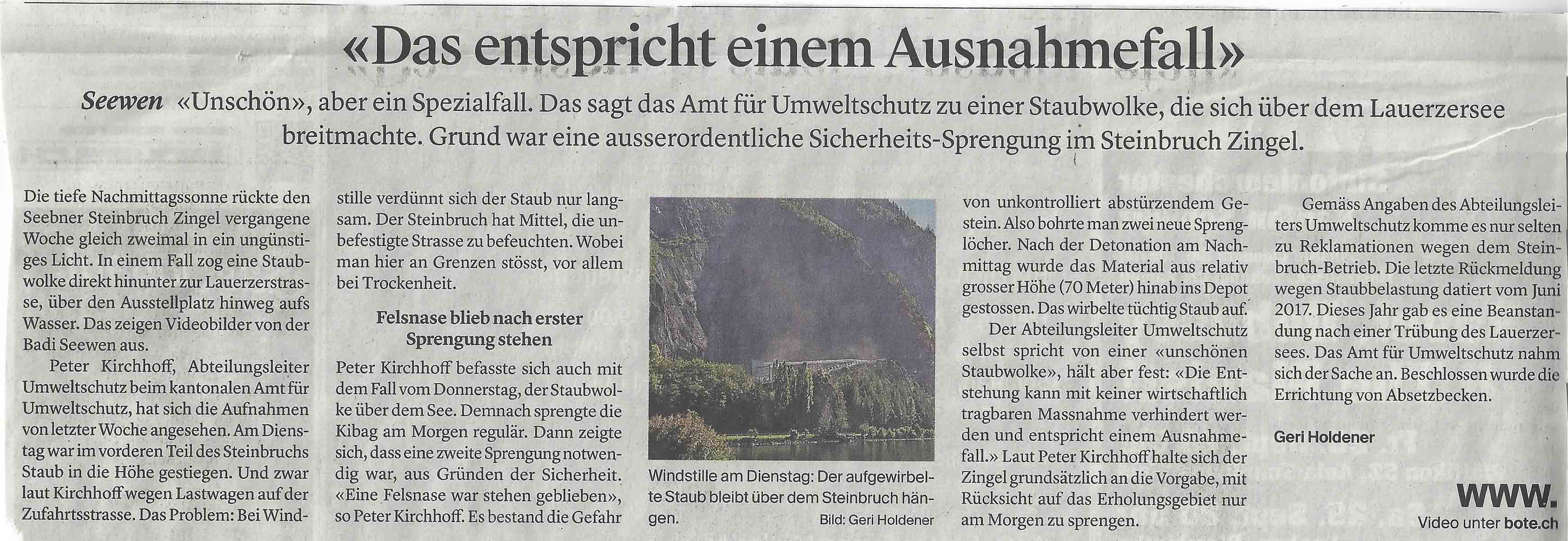 Im der Regionalzeitung Bote der Urschweiz war am 26. September 2018 über die jüngsten Sprengungen Folgendes zu lesen: