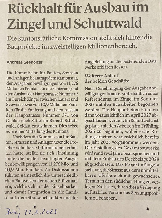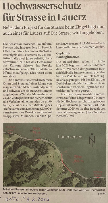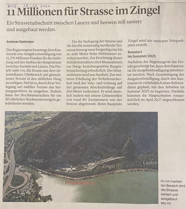 p. Es leckt keine Geiss weg: die Lauerzerstrasse zwischen Seewen und Lauerz ist in einem teils 'erbärmlichen' Zustand. Nicht nur, dass sie sich gegen den See hin senkt (mit allen Nebeneffekten wie Risse und Löcher im Belag), auch die regelmässigen Ueberflutungen bei Hochwasser sind alles andere als eine Augenweide. Die Verkehrsteilnehmer werden daher auf Verkehrstafeln angewiesen, achtsam entlang des Sees zu fahren. Das angeordnet hat das kantonale Tiefbauamt, welches nun eine umfangreiche Sanierung aufgegleist hat. Sofern der Kantonsrat das Vorhaben durchwinkt, werden für den Abschnitt entlang des Steinbruchs Zingel 11,276 Millionen Franken aufgewendet. Und weitere rund 1,5 Millionen Franken werden vom Kanton budgetiert, um den Abschnitt beim 'Otten' und 'Stutz' wieder sicher/er zu machen. Mit dem Baustart soll im Sommer 2025 (Bereich 'Zingel') und 2026 (Lauerzer Teil) gestartet werden. Die entsprechenden Meldungen publizierte der 'Bote der Urschweiz':