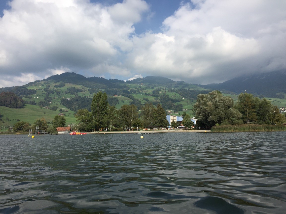 Wassertemperatur vor der Gemeindebadi in Seewen immer noch 22 Grad Celsius.
