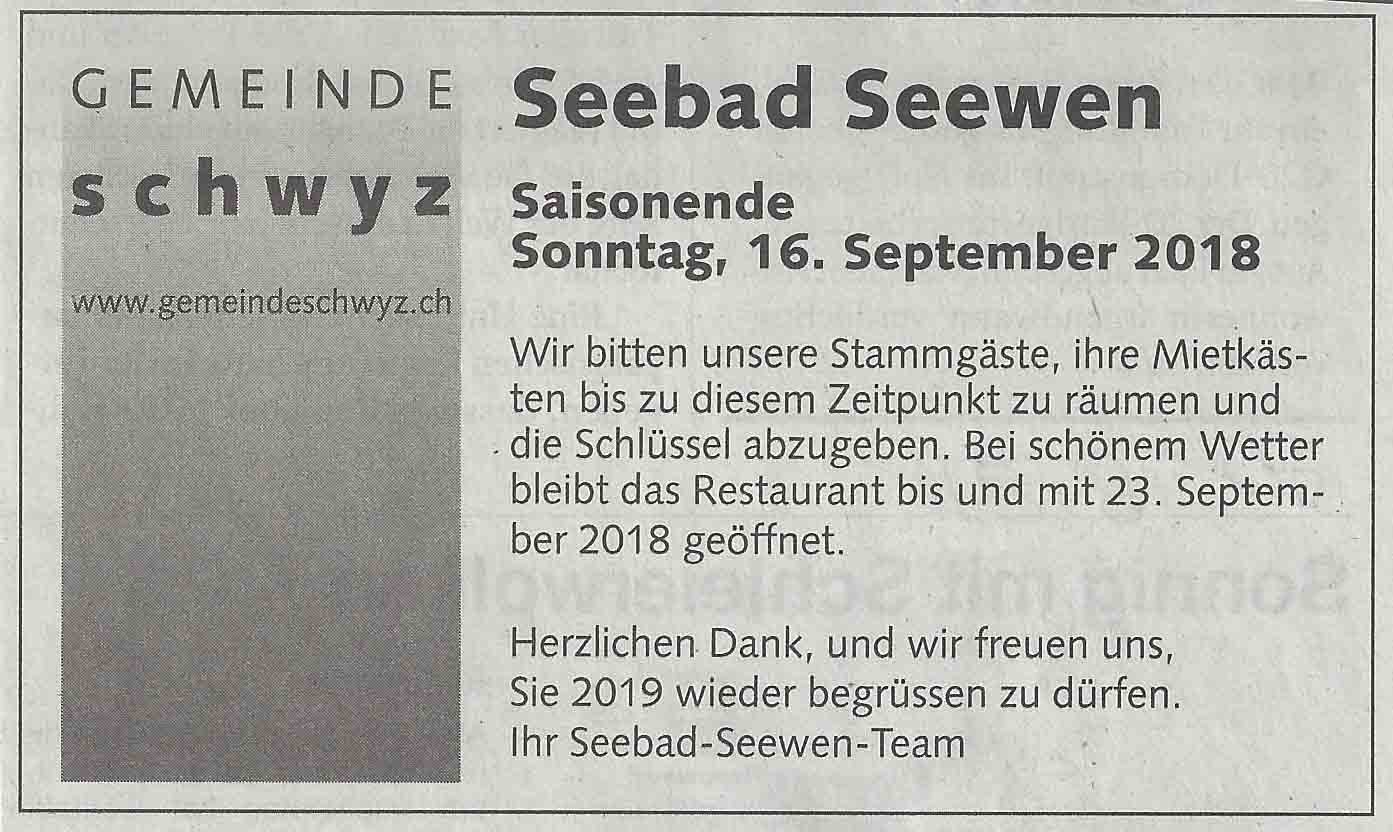 p, Traditionsgemäss schliesst am Eidg. Buss-, Dank- und Bettag die Seebner Badi offiziell ihre Türen – obwohl die Wassertemperatur noch 22 Grad Celsius beträgt. Doch irgendwann hat alles einmal ein Ende. Rückblickend weiss man jetzt schon: der Sommer 2018 geht in die Annalen ein, als einer der heissesten und vor allem trockensten überhaupt. Genaue Angaben werden wohl in den nächsten Tagen publiziert… Wie die Gemeinde als Eigentümerin der Badi-Anlage in einem Inserat verlauten liess, bleibt das Restaurant noch einige Tage geöffnet – bis 23. September.