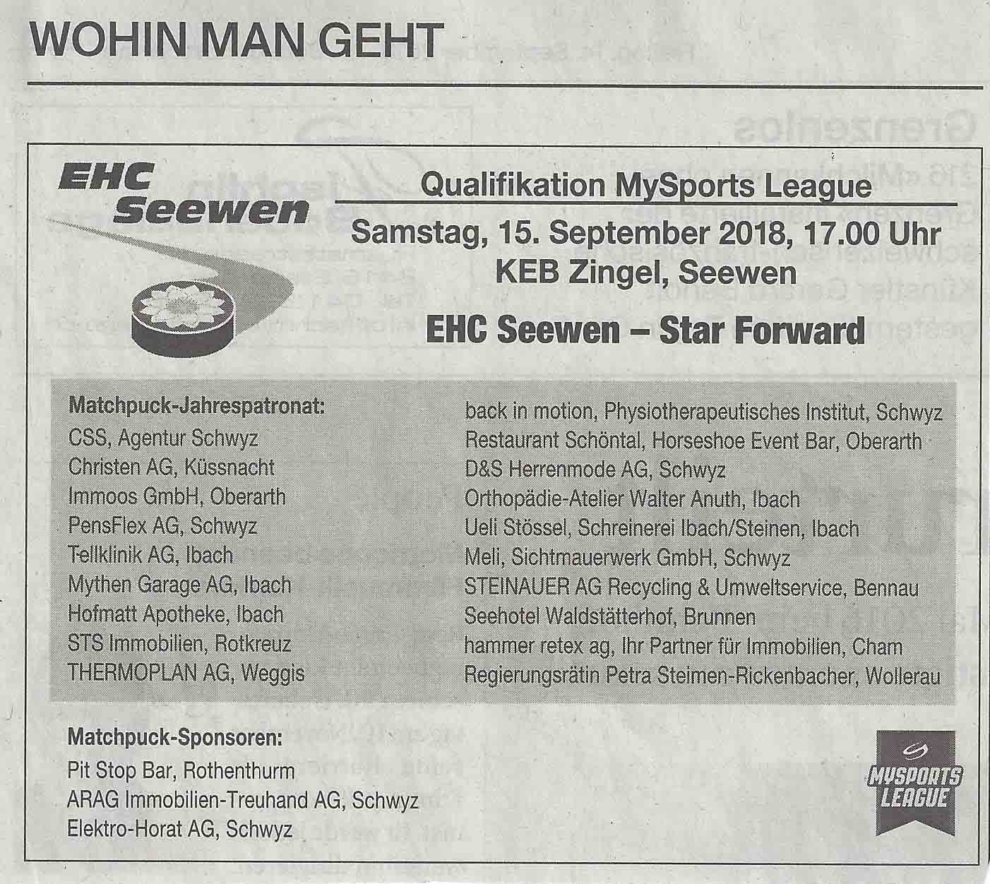 Mit einem Inserat in der gleichen Zeitungsausgabe wurde auf das erste Meisterschaftsspiel der Saison hingewiesen: