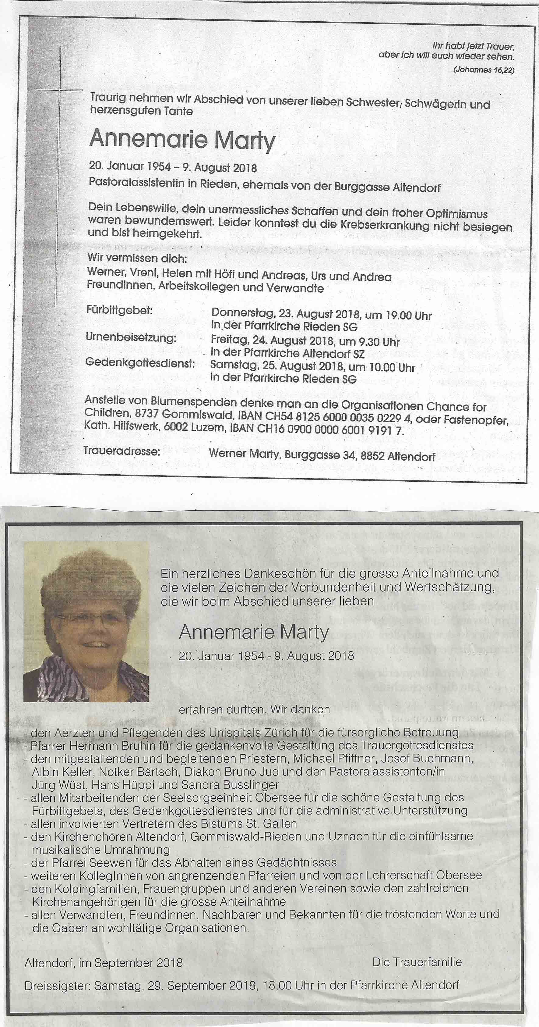 p. Sie war über ein Viertel Jahrhundert eine prägende Figur in Seewen: Annemarie Marty, ehemals wohnhaft im Stelzli an der Bahnhofstrasse. Jetzt ist sie nicht mehr unter uns, sie verstarb am 9. August des Jahres an den Folgen einer schweren Krankheit. Auf verschiedenen Lebensabschnitten machte sie Station in Seewen. So war sie von 1981 bis 2007 zuerst Seelsorgehelferin und dann Pastoralassistentin in unserer Pfarrei, quasi die rechte Hand von Pfarrer Anton Immoos (gest. 3.5.2016). Ihr Engagement in unserer Gemeinde galt vorwiegend der Jugend. Eine ganze Generation lernte von ihr – den Glauben an Gott. Mit der Einsetzung von Gemeindeleiter Noldi Landtwing brach Annemarie auf zu neuen Ufern. Ihre neue Herausforderung war das Theologiestudium in Luzern, welches sie mit Erfolg abschloss. Ab 1. August 2007 trat sie dann eine neue Aufgabe als Pastoralassistentin der Seelsorgeeinheit Obersee (Rieden und Uznach SG) an. Hier wirkte sie bis zu ihrem Ableben.